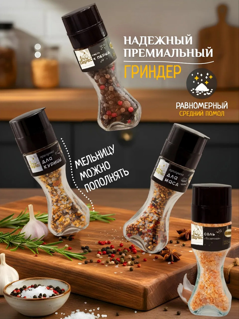 Подарочный набор специй в мельницах. Стильная упаковка станет украшением любой кухни и не требует дополнительного украшения подарка. Универсальный дизайн подойдет как женщине, так и мужчине. Этот набо... Показать описаниер приправ в мельнице станет приятным подарком на новый год, маме, бабушке, учителю, подруге или коллеге. В составе: - чесночная соль (соль, чеснок) - приправа для мяса (соль морская, кориандр, перец черный, чеснок, паприка красная) - приправа для курицы (соль морская, чеснок, шамбала, корица, перец черный, цедра апельсина) - смесь 4 перцев (черный, душистый, белый, розовый