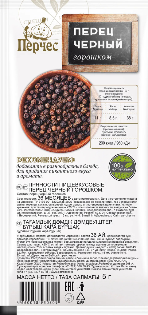 Перец черный горошком — это целые зерна черного перца, которые используются в кулинарии для придания блюдам острого и пряного вкуса. Зерна черного перца имеют темно-коричневый или черный цвет и облада... Показать описаниеют сильным ароматом. Они используются в кулинарии для приготовления различных блюд, включая мясо, рыбу, овощи, супы и соусы. Перец черный горошком можно использовать целиком или размолоть в порошок. Он также может использоваться в качестве приправы для салатов и маринадов