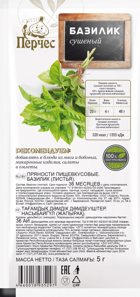 Базилик имеет интенсивный травянистый аромат и сладковатый вкус с лёгкой горчинкой. Базилик — одна из самых популярных трав в кулинарии. Он широко используется в средиземноморской, итальянской и франц... Показать описаниеузской кухнях. Его добавляют в салаты, соусы, супы, ризотто, пасту, пиццу, а также в различные мясные и рыбные блюда. Сушёный базилик сохраняет свой аромат и вкус даже после длительного хранения. Это делает его удобным для использования в любое время года. Базилик отлично сочетается и с другими пряными травами
