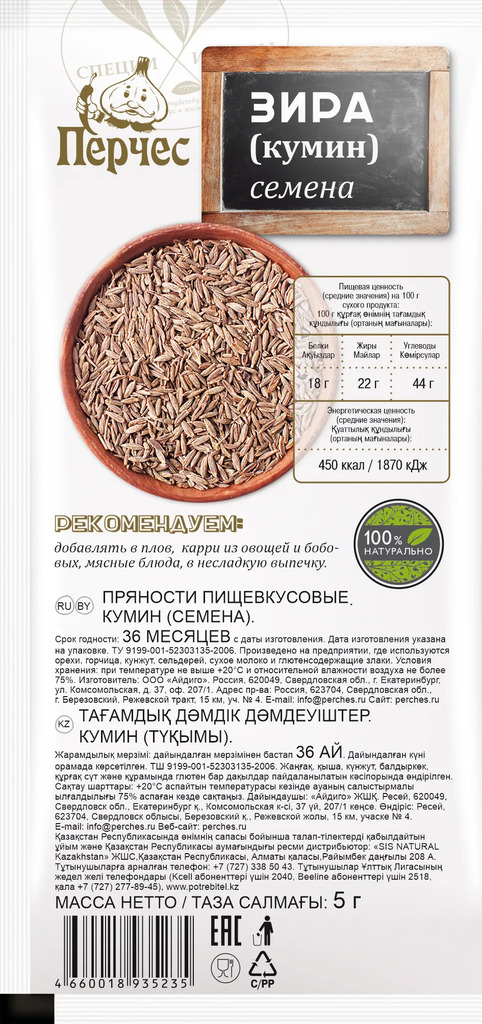 Зира, или кумин, — это специя, которая интенсивный аромат и слегка горьковатый вкус. Зира широко используется в кулинарии разных стран, особенно в Индии, Среднем Востоке и Латинской Америке. Её добавл... Показать описаниеяют в карри, чатни, чили, фахитас, кебаб, а также в различные мясные и овощные блюда. Сушёная зира сохраняет свой аромат и вкус даже после длительного хранения. Рекомендуем добавлять в плов, карри из овощей и бобовых, мясные блюда, а также несладкую выпечку