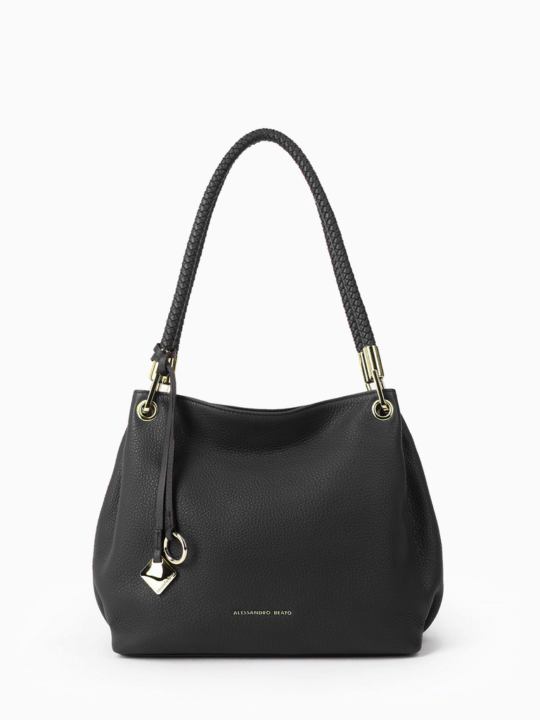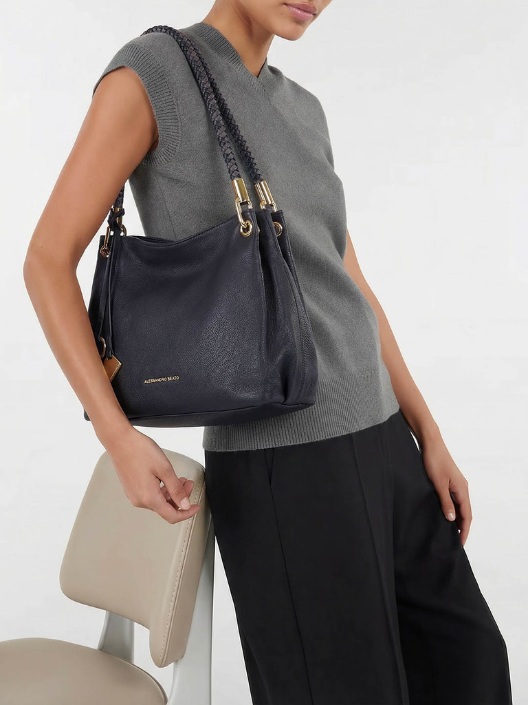 Шоппер с длинными плетёными ручками от Alessandro Beato из натуральной кожи черного цвета Длина сумки Алессандро Беато (Alessandro Beato) - 33 (30) см, ширина по дну - 15 см, высота - 27 см, общая выс... Показать описаниеота - 57 см. Сумочка выполнена из буклированной кожи - хит продаж этого и прошлых сезонов! Сумочка закрывается на молнию. Внутри центральное отделение на молнии, сбоку карман на молнии, карманы для мелочей. Снаружи сзади карман на молнии. Сумочка носится на плече.