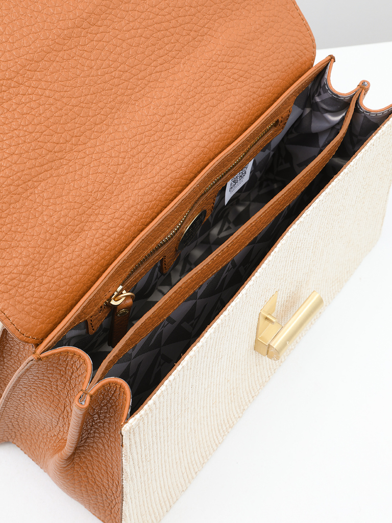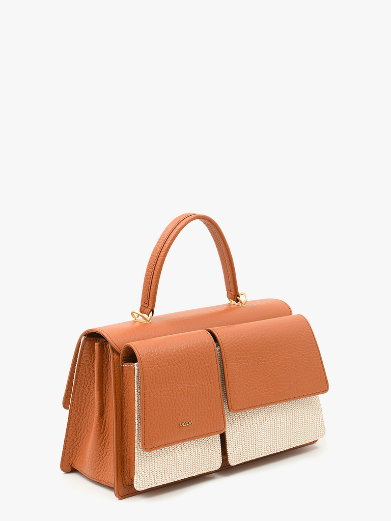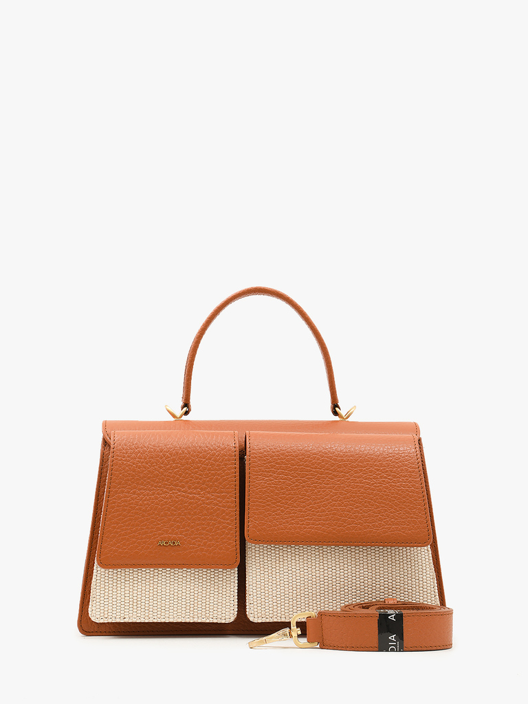 Сумка-портфель с цилиндрическим замком от ARCADIA из рафии и натуральной кожи рыжего оттенка Материал: натуральная кожа / рафия Размеры: Длина по дну: 32,5 см Длина по верхнему краю: 29 см Ширина по д... Показать описаниену: 12 см Высота: 18,5 см Общая высота с ручкой: 34 см Описание: Классический портфель от итальянского бренда ARCADIA выполнен из натуральной кожи и рафии, декорирован цилиндрическим замком золотого оттенка. Данная модель закрывается клапаном на поворотную фурнитуру, носится на сгибе руки, в руке или на плече на регулируемом ремне Внутри: два отделения, боковой карман на молнии Снаружи: на задней стенке расположены два кармана, закрываются на магнитную кнопку Производитель: Arcadia s.r.l., Италия Расположение производства: Италия