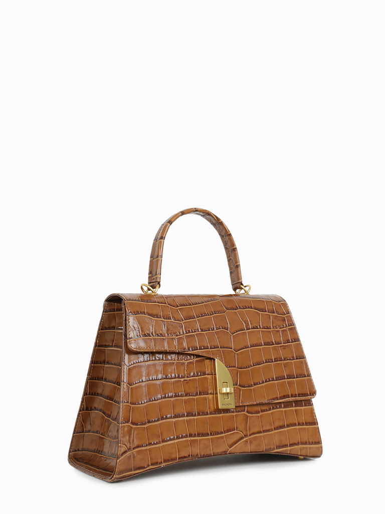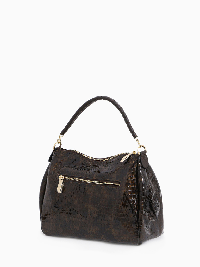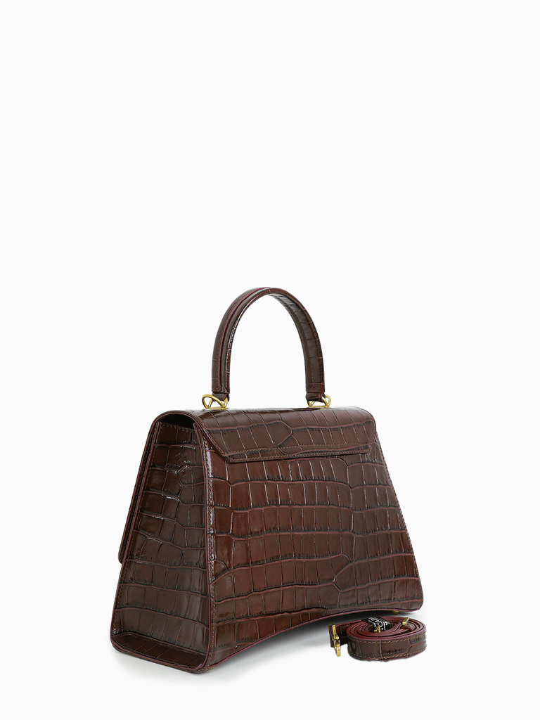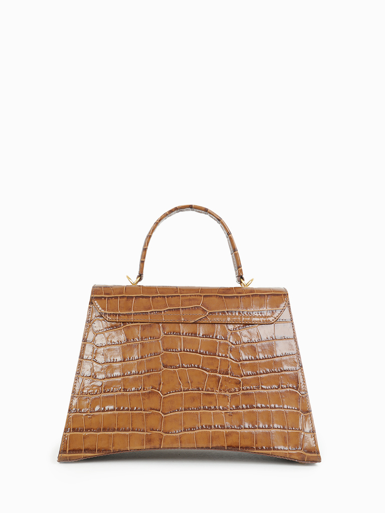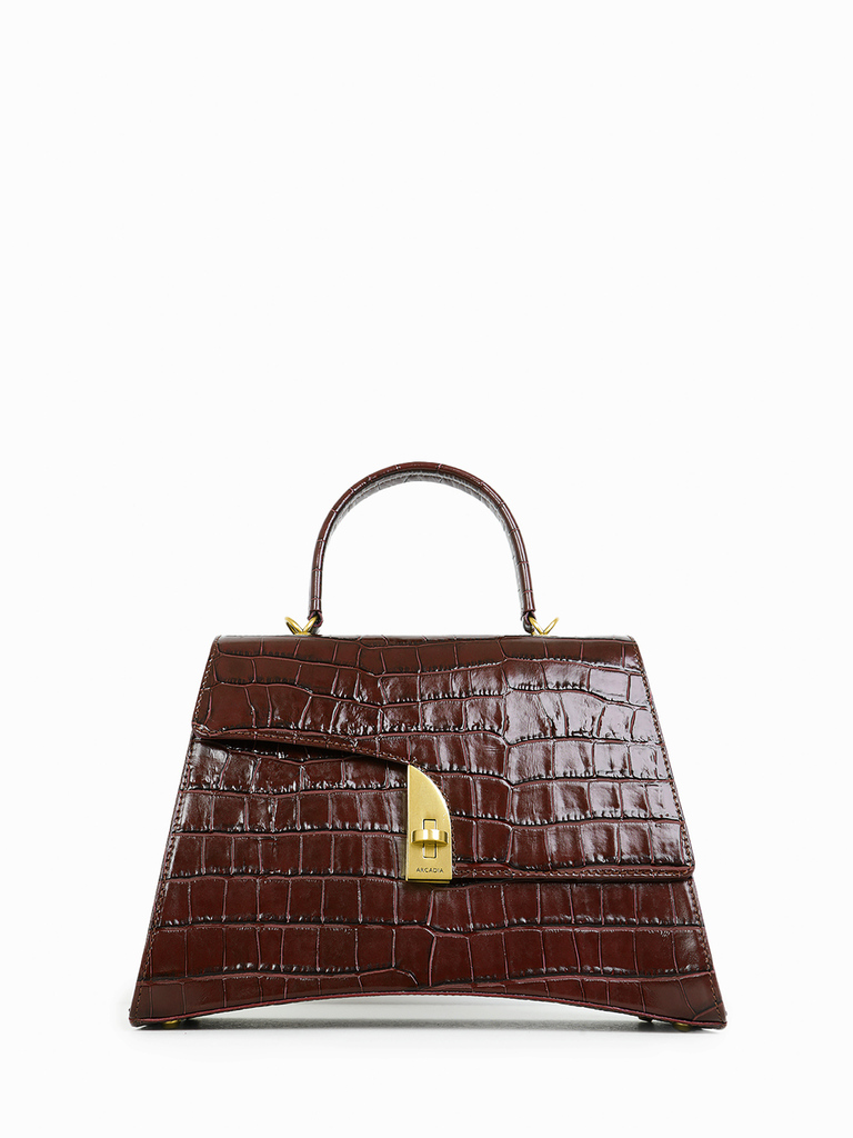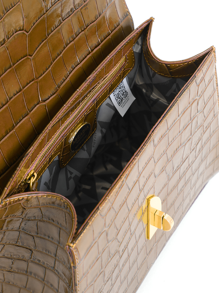 Коричневый сэтчел от ARCADIA с ассиметричным клапаном Материал: натуральная кожа Размеры: Длина по дну: 32,5 см Длина по верхнему краю: 26,5 см Ширина по дну: 14 см Высота: 23 см (сбоку) Общая высота ... Показать описаниес ручками: 36 см Описание: Стильная сумка классической формы от итальянского бренда ARCADIA выполнена из натуральной кожи с выделкой под крокодила. Данная модель закрывается клапаном на поворотную фурнитуру, носится на сгибе руки, в руке или на плече. Длина ремешка на плечо - 131 см, регулируемся. Прилагается фирменный пыльник. Внутри: боковой карман на молнии, открытое отделение для мелочей Снаружи: на дне металлические ножки Производитель: Arcadia s.r.l., Италия Расположение производства: Италия