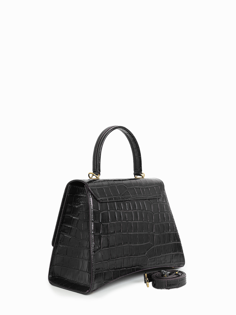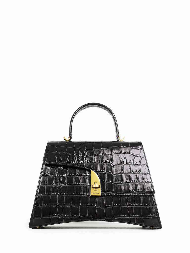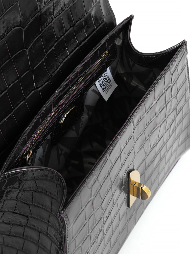 Чёрный сэтчел от ARCADIA с ассиметричным клапаном Материал: натуральная кожа Размеры: Длина по дну: 32,5 см Длина по верхнему краю: 26,5 см Ширина по дну: 14 см Высота: 23 см (сбоку) Общая высота с ру... Показать описаниечками: 36 см Описание: Стильная сумка классической формы от итальянского бренда ARCADIA выполнена из натуральной кожи с выделкой под крокодила. Данная модель закрывается клапаном на поворотную фурнитуру, носится на сгибе руки, в руке или на плече. Длина ремешка на плечо - 131 см, регулируемся. Прилагается фирменный пыльник. Внутри: боковой карман на молнии, открытое отделение для мелочей Снаружи: на дне металлические ножки Производитель: Arcadia s.r.l., Италия Расположение производства: Италия