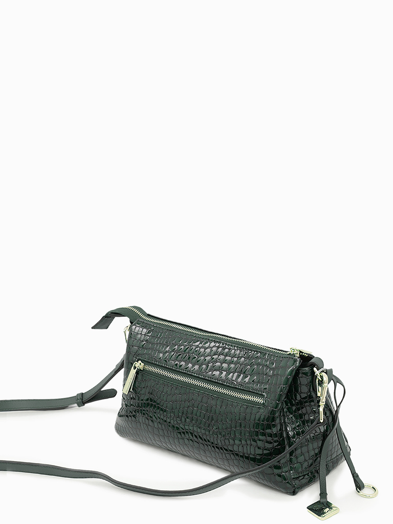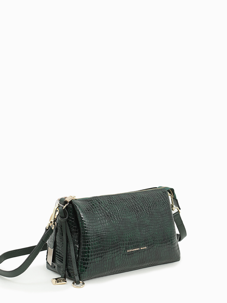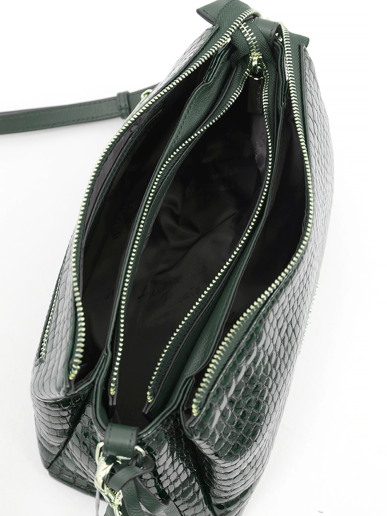 Кросс-боди от Alessandro Beato в лаковой коже в изумрудном цвете Материал: натуральная лаковая кожа Размеры: Длина по дну: 26,5 см Длина по верхнему краю: 25 см Ширина по дну: 11 см Высота: 17 см Опис... Показать описаниеание: Изящная кросс-боди от итальянского бренда Alessandro Beato выполнена из натуральной лаковой кожи, декорирована фирменной фурнитурой. Данная модель закрывается на молнию, носится на плече на ремне, длина которого 115 см (регулируется) Внутри: три отделения, центральное отделение на молнии, боковой карман на молнии, карманы для мелочей Снаружи: на задней стенке расположен карман на молнии Производитель: Alessandro Beato, Италия Расположение производства: Китай