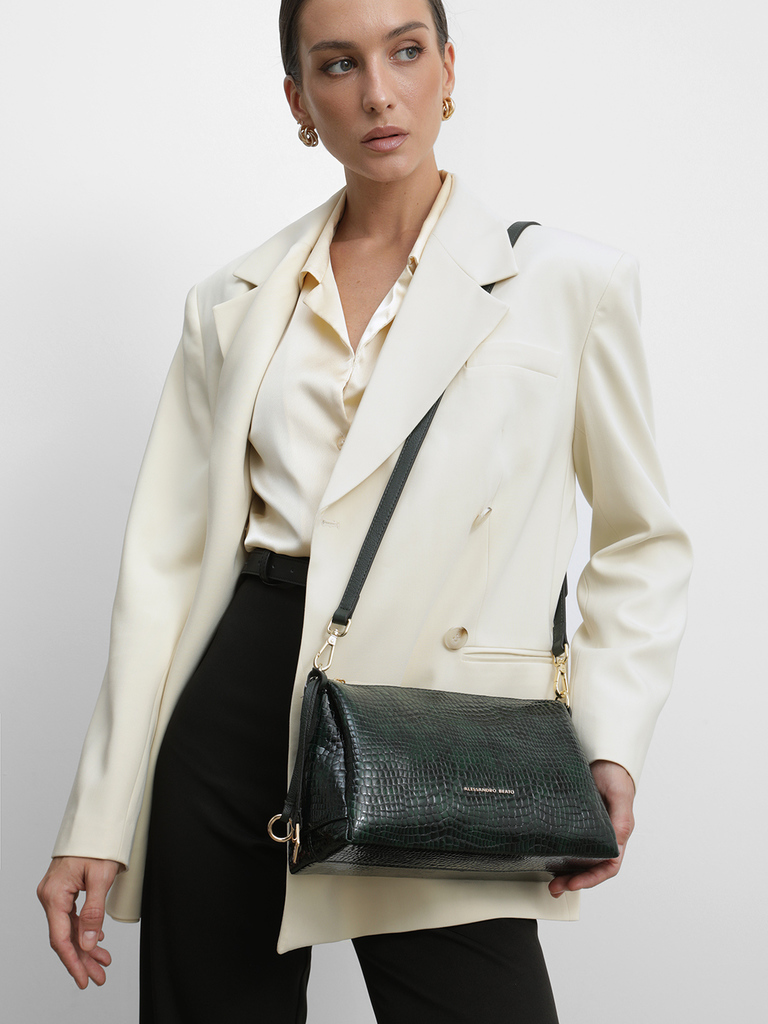 Кросс-боди на плечо с цветочным тиснением от Alessandro Beato зелёного цвета Материал: натуральная кожа Размеры: Длина по дну: 23,5 см Длина по верхнему краю: 21,5 см Ширина по дну: 8,5 см Высота: 18 ... Показать описаниесм Описание: Изящная кросс-боди от итальянского бренда Alessandro Beato выполнена из натуральной кожи, декорирована цветочным тиснением и фирменной фурнитурой. Данная модель закрывается клапаном на поворотную фурнитуру, носится на плече на ремне, длина которого 128 см (регулируется) Внутри: центральное отделение на молнии, боковой карман для документов на молнии, карманы для мелочей Снаружи: на задней стенке расположен карман на молнии, на передней стенке под клапаном расположено отделение Производитель: Alessandro Beato, Италия Расположение производства: Китай