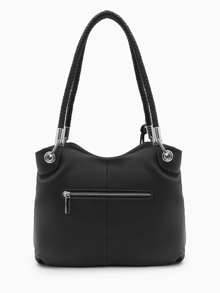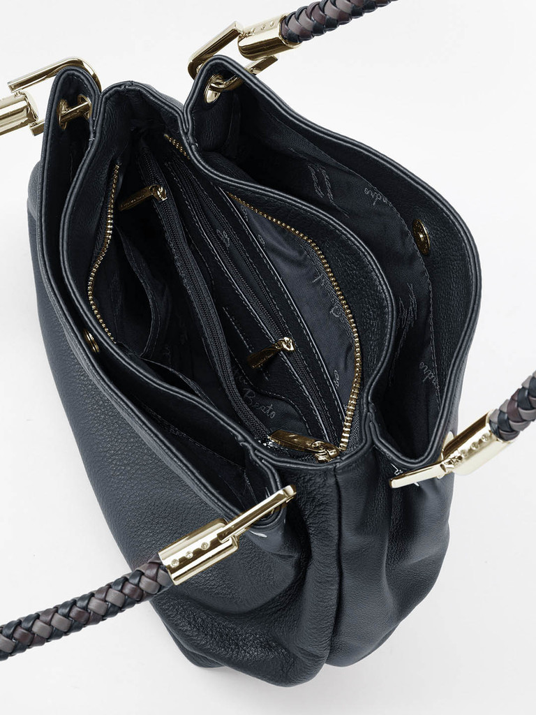 Шоппер с длинными плетёными ручками от Alessandro Beato из кожи черного цвета Длина сумки Алессандро Беато (Alessandro Beato) - 29 см (по дну), 24 см (по верхнему краю), ширина по дну - 13 см, высота ... Показать описание- 25 см, общая высота с ручками - 42 см. Сумочка состоит из трех автономных отделений, центральное закрывается на молнию, боковые на магнитные кнопки. Внутри сбоку отделение на молнии, карманы для мелочей. Снаружи сзади карман на молнии. Сумочка носится на плече или на сгибе руки. Удобная практичная повседневная сумочка!