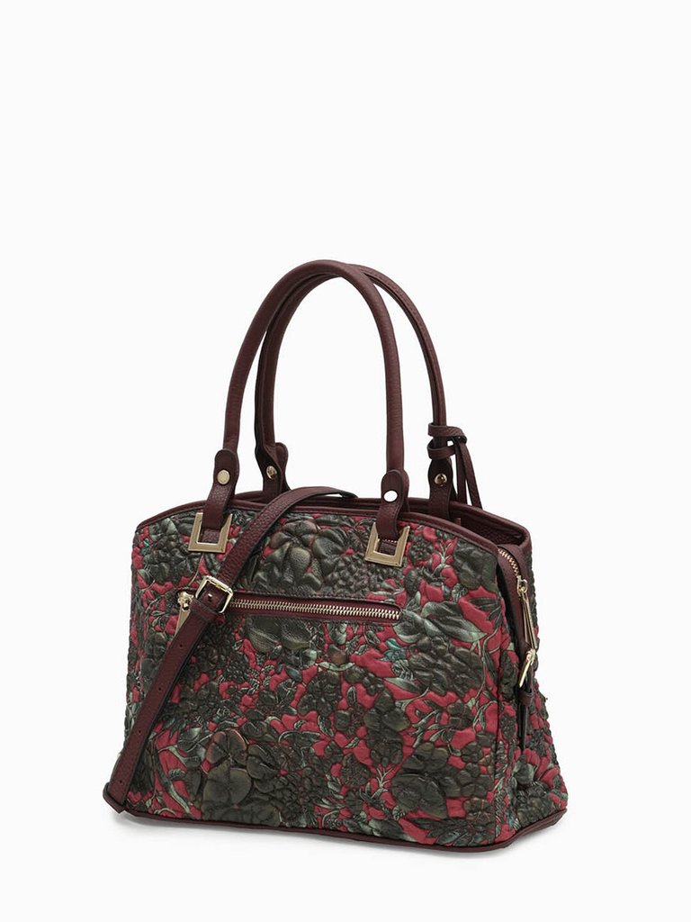 Тоут от Alessandro Beato из натуральной кожи букле бордового цвета с цветочным принтом Длина сумочки Алессандро Беато (Alessandro Beato) - 34 см (по дну), 30 см (по верхнему краю), ширина по дну... Показать описание - 13 см, высота - 23,5 см, общая высота с ручками - 39 см. Сумочка состоит из трех автономных отделений, центральное закрывается на молнию, боковые на магнитные кнопки. Внутри центральное отделение на молнии, сбоку карман на молнии, карманы для мелочей. Сумочка носится на плече, на сгибе руки или в руке. Прилагается длинный регулируемый ремешок на плечо, максимальная длина - 120 см.