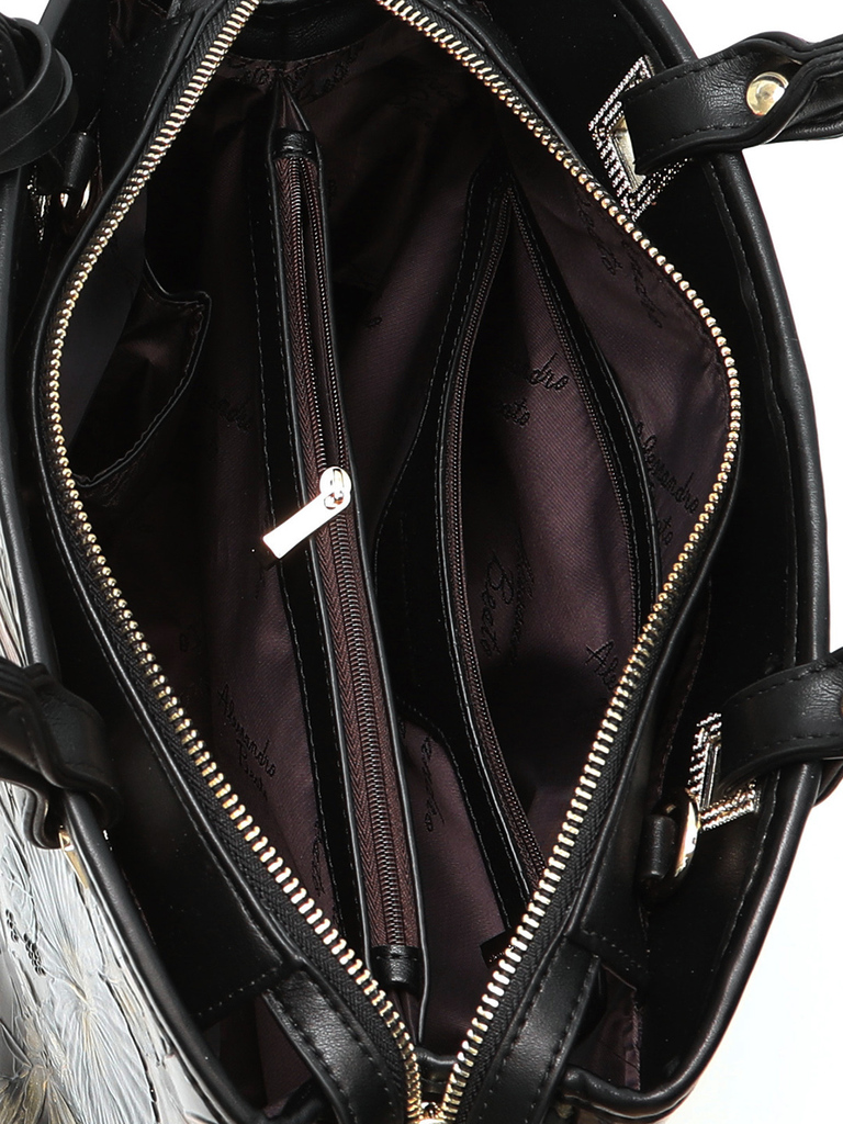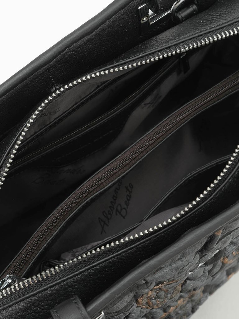 Тоут от Alessandro Beato из натуральной кожи черного цвета с объемным тиснением и цветочным принтом Длина сумочки Алессандро Беато (Alessandro Beato) - 34 см (по дну), 30 см (по верхнему краю), ... Показать описаниеширина по дну - 13 см, высота - 23,5 см, общая высота с ручками - 39 см. Сумочка состоит из трех автономных отделений, центральное закрывается на молнию, боковые на магнитные кнопки. Внутри центральное отделение на молнии, сбоку карман на молнии, карманы для мелочей. Сумочка носится на плече, на сгибе руки или в руке. Прилагается длинный регулируемый ремешок на плечо, максимальная длина - 120 см.