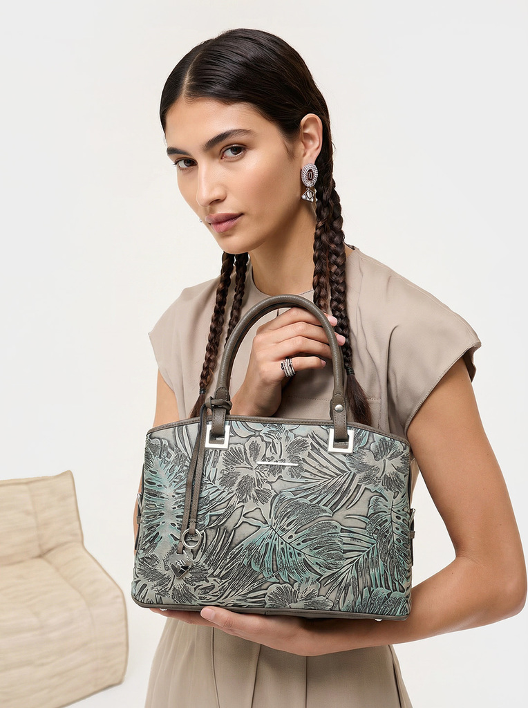 Сумка с ручкой с серебристыми люверсами и цветочным тиснением от Alessandro Beato оттенка тауп Материал: натуральная кожа Размеры: Длина по дну: 24 см Длина по верхнему краю: 21 см Ширина по дну: 10,5... Показать описание см Высота: 22 см Общая высота с маленьким ремнём: 33 см Описание: Лаконичная кросс-боди от итальянского бренда Alessandro Beato выполнена из натуральной кожи, декорирована объёмным тиснением и логотипом бренда. Данная модель закрывается на молнию и на магнитную кнопку, носится на плече или в руке Внутри: одно отделение, боковой карман для документов на молнии, карман для мелочей Дополнительно: прилагается два ремня: короткий ремень на плечо - 44 см (не регулируется), длинный ремень на плечо - 80 см (не регулируется) Производитель: Alessandro Beato, Италия Расположение производства: Китай
