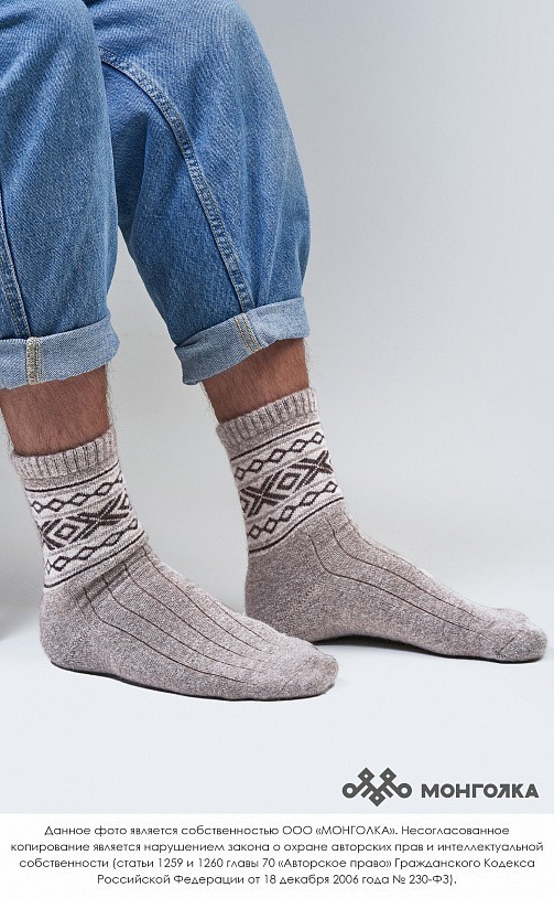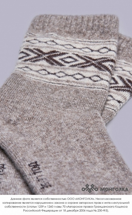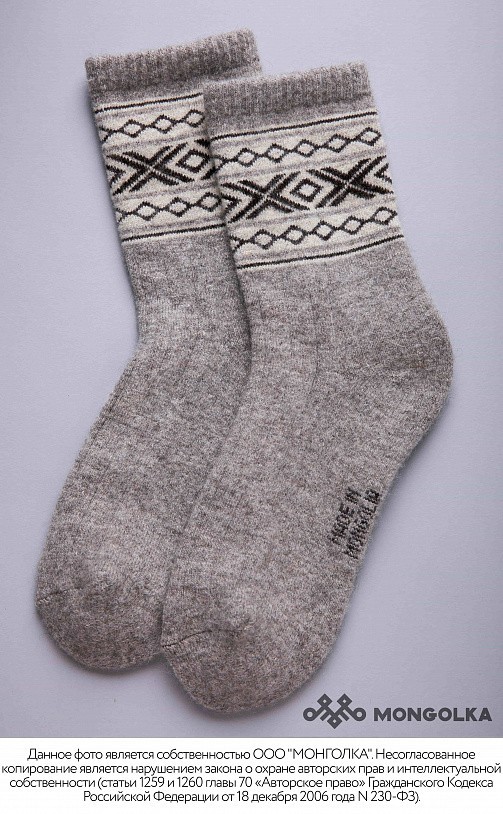 Носки из 100% натуральной шерсти монгольской овцы подарят ногам тепло и уют. Теплые носки плотно облегают стопу, хорошо фиксируются и не спадают при носке. На подошве используется технология двойной в... Показать описаниеязки, благодаря которой носки прослужат и согреют вас долгое время. В составе носков 100% натуральной овечьей шерсти, которая обладает обезболивающими, антибактериальными, противовоспалительными свойствами, из-за чего носки помогут при болях в суставах и усилят микроциркуляцию крови. Благодаря свойствам натуральной шерсти носки отводят лишнюю влагу и подарят чувство тепла и сухости в любую погоду. Шерстяные носки хорошо сочетаются с любым образом, поэтому в них будет приятно ходить как дома, так и надевать с зимней обувью. Носки подойдут как мужчинам, так и женщинам и станут приятным подарком для близких. В нашем ассортименте вы найдете еще больше товаров из натуральной шерсти, доставленных напрямую из Монголии. * Производитель: Монголия, TOD * Состав: 100% шерсть монгольской овцы * Цвет: серый с рисунком * Размер: 34-45 * Полноразмерные, соответствуют размеру обуви * Укрепленная стопа