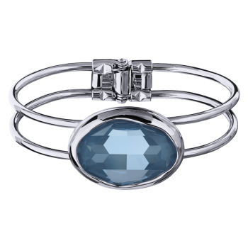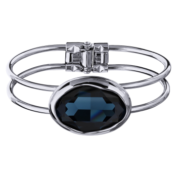 Изготовлено из ювелирного сплава на основе латуни с гальваническим покрытием родием. Изделие украшают кристаллы SW синего цвета. Ширина браслета 8мм. Пружинный механизм отвода.