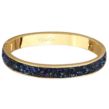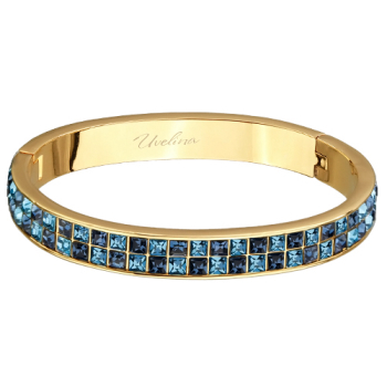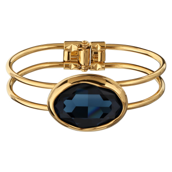 Изготовлено из ювелирного сплава на основе латуни с гальваническим покрытием золотом. Изделие украшают кристаллы SW синего цвета. Ширина браслета 8мм. Пружинный механизм отвода.