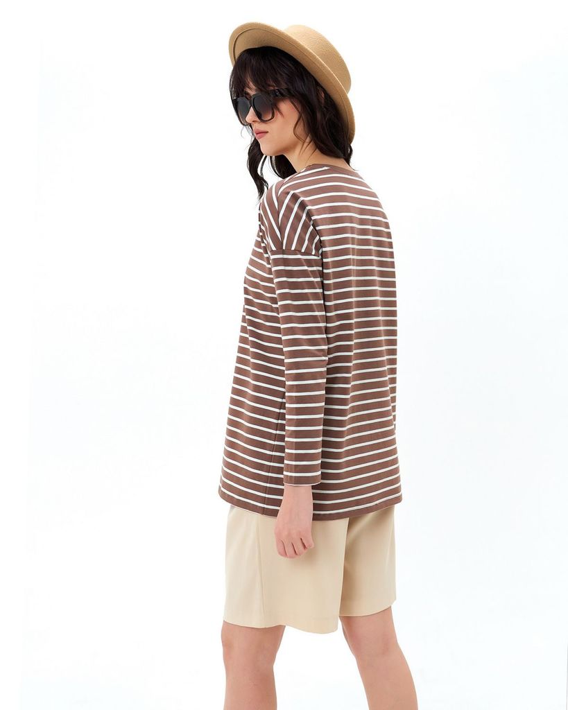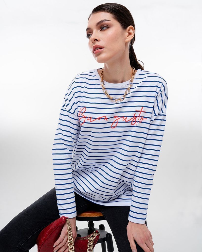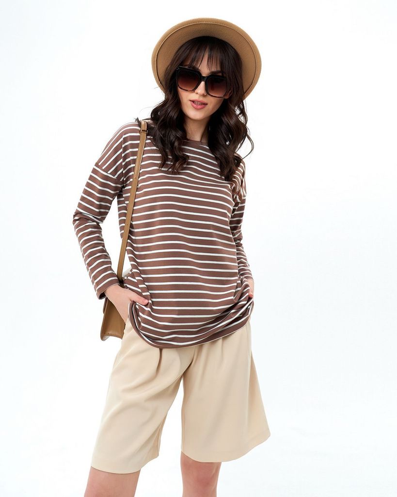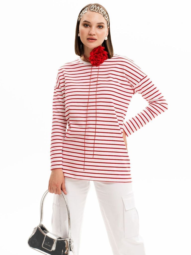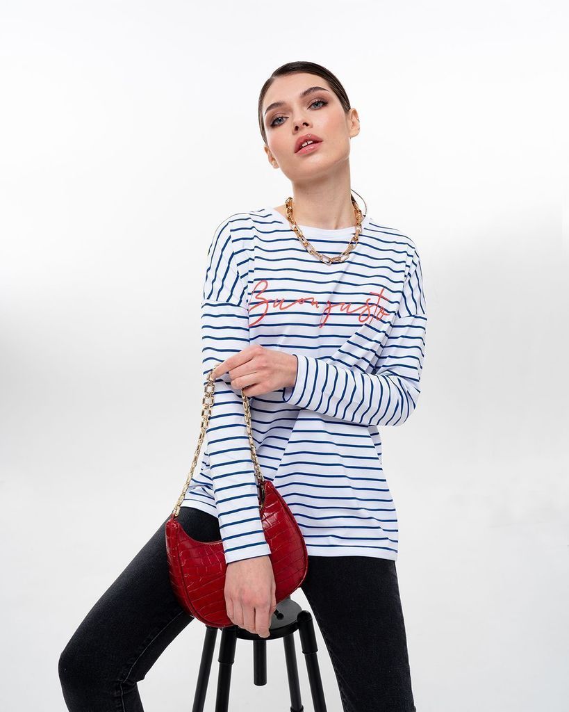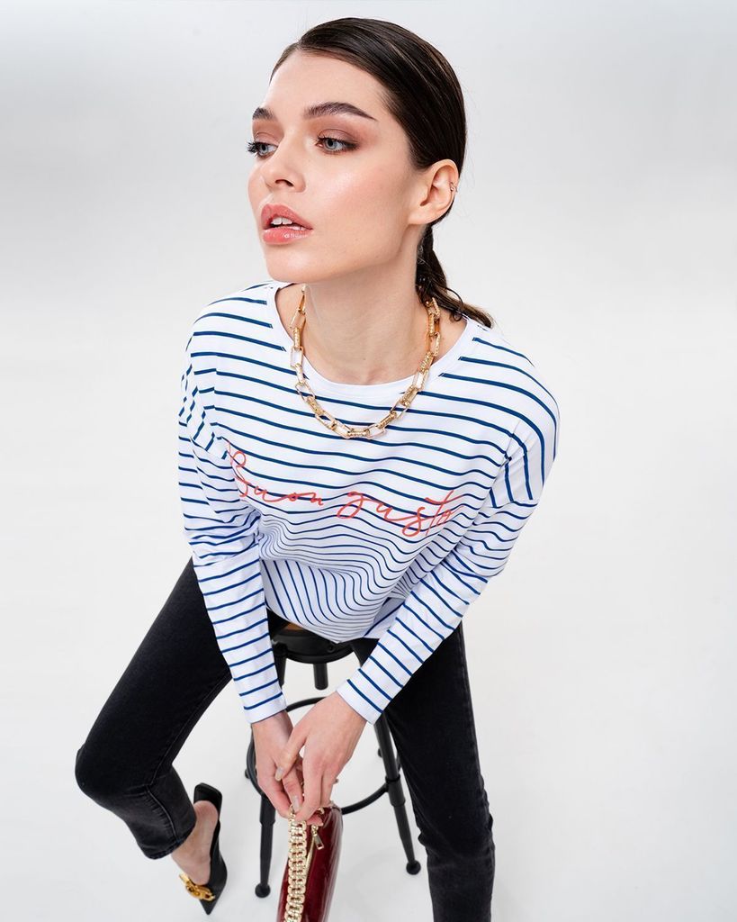 Базовый лонгслив в полоску — легкая модель для создания расслабленных спокойных образов. Сделан он из приятной для тела хлопковой кулирки. Это ткань, которая дышит, гипоаллергенна и не вызывает раздра... Показать описаниежений. Мягкая и эластичная кулирка хорошо переносит стирки и служит долго. Поэтому можете быть уверены, что изделие с вами на несколько сезонов. Поставщиком ткани для нас является Турция. Лонгслив можно выбрать в двух вариантах: с надписью на груди или без неё. Изделие свободного кроя со спущенной линией плеча идеально садится на любую фигуру. В ней будет комфортно девушкам и с узкими плечами, и с широкими. В базовых вещах особенно важно удобство в мельчайших деталях. Мы уделяем внимание каждому шву, чтобы вы носили изделия с удовольствием и пониманием, что они выглядят идеально не только с лицевой стороны, но и с изнаночной, а ещё не натирают и не создают дискомфорт. Состав: 95% хлопок, 5% лайкра
