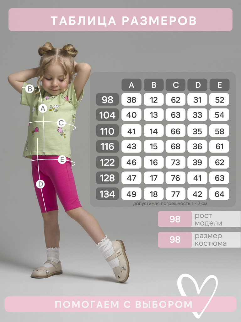 Этот костюм мы создали специально для красавиц, которые ценят стиль и комфорт в одном образе. Авторский принт, модное сочетание цветов и удобство в движении - это все есть в этом комплекте одежды. Кос... Показать описаниетюм универсален - можно носить по отдельности и вместе. У футболки отсутствуют пуговицы и молния. Благодаря этому, маленькая принцесса сможет самостоятельно надеть и снять наряд. Горловина не узкая и не широкая, сделана по стандартным лекалам. Велосипедки сделаны из эластичного материала, в пояс вшита резинка для удобства Вашей девочки. В них можно заниматься любыми активностями, ходить в школу, на летние прогулки и для домашнего времяпровождения. Минимальный оптовый заказ для новичков 5000 руб. Доставка по России и странам СНГ.