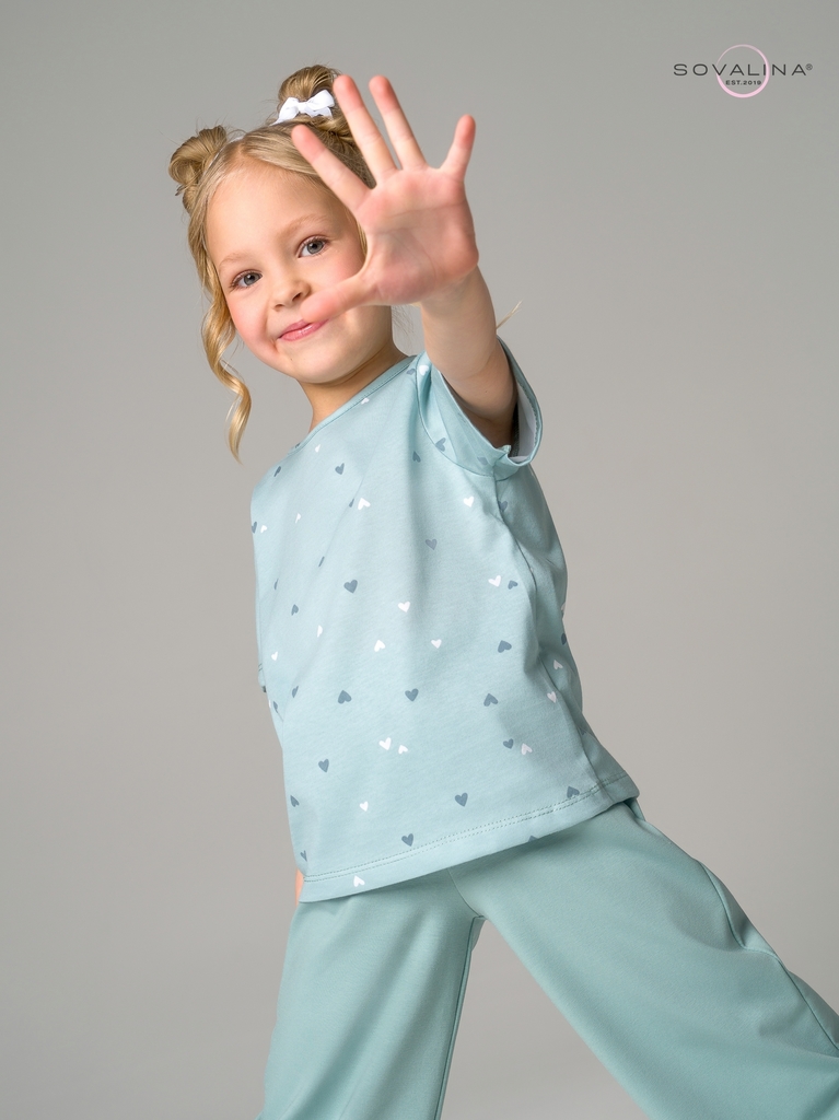 Комплект двойка TM SOVAlina для девочек, который позволит им чувствовать себя стильно и комфортно в любое время года, включая весенний и летний период. В комплект входит свободная футболка с принтом и... Показать описание короткими рукавами и брюки палаццо. Детский спортивный и стильный комплект подходит для садика. Широкие штаны клеш обладают свободным кроем. Хлопковая ткань и вшитая в пояс резинка создают комфорт и свободу в активностях ребенка. Эта милая футболка с расклешенными брюками и их яркий цвет придадут для девочки дополнительную индивидуальность на солнечное лето, теплую осень и отопительный сезон в помещении. Костюмчик изготовлен из высококачественного трикотажа, он хлопковый и легкий - идеальный выбор для активных игр в саду или как домашняя пижама для детей. Этот домашний костюмчик не только функционален, но также приятен наощупь благодаря тонкому дышащему материалу. Создайте своему ребенку возможность чувствовать себя уютно, модно и стильно одновременно!