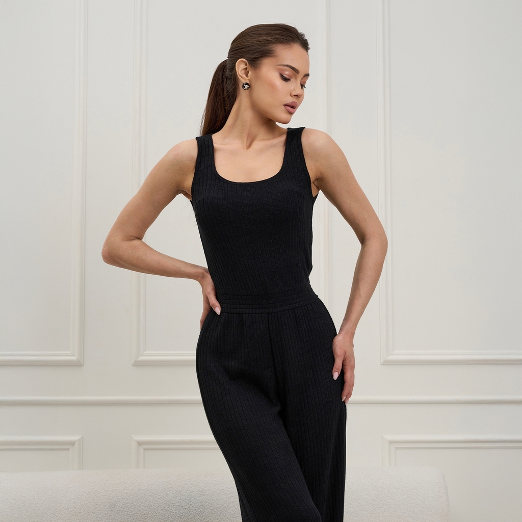 Комбинезон с брючинами прямого кроя, резинкой по линии талии и открытым верхом с вырезом "каре".Материал: Состав: 52% полиэстер, 45% вискоза, 3% лайкра.