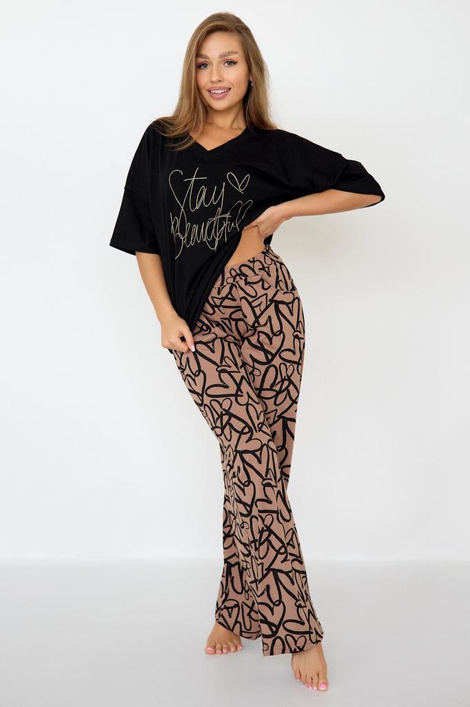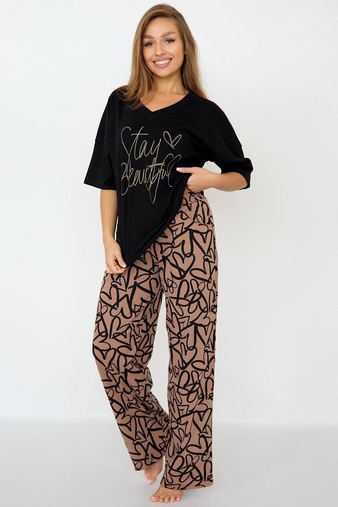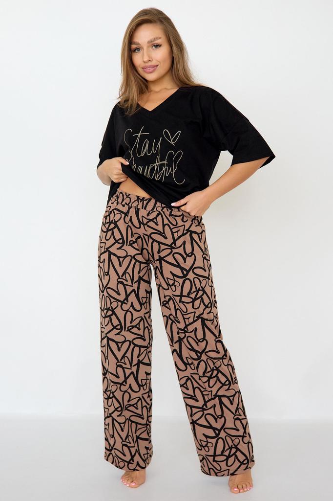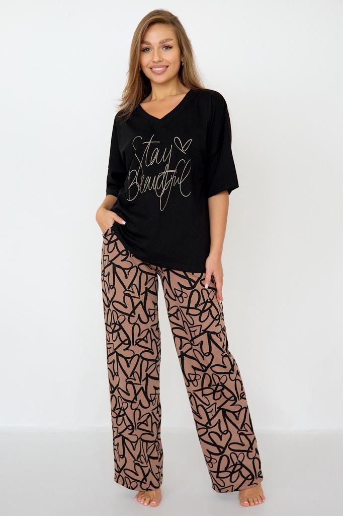 Пижама из 100% хлопка, мягкая, дышащая и комфортная к телу. Комплект состоит из футболки с V-образным вырезом и прямых брюк на резинке с удобными карманами. Благодаря стильному свободному крою её можн... Показать описаниео использовать не только для сна, но и как полноценную домашнюю одежду. Широкий размерный ряд позволяет подобрать идеальный вариант для любой фигуры. * Артикул: 10231 * Состав Хлопок 100% * ГОСТ 31409-2009 * Цвет Черный/коричневый * Изготовитель ИП Вартанян Марина Валерьевна * Торговая марка Lika Dress * Тип ткани Кулирка * Длина изделия Футболка: 48/50-62, 52/54-63, 56/58-65, 60/62-67 Брюки: 48/50-76, 52/54-76, 56/58-76, 60/62-76 * Для кого для женщин * ТН ВЭД 6108310000