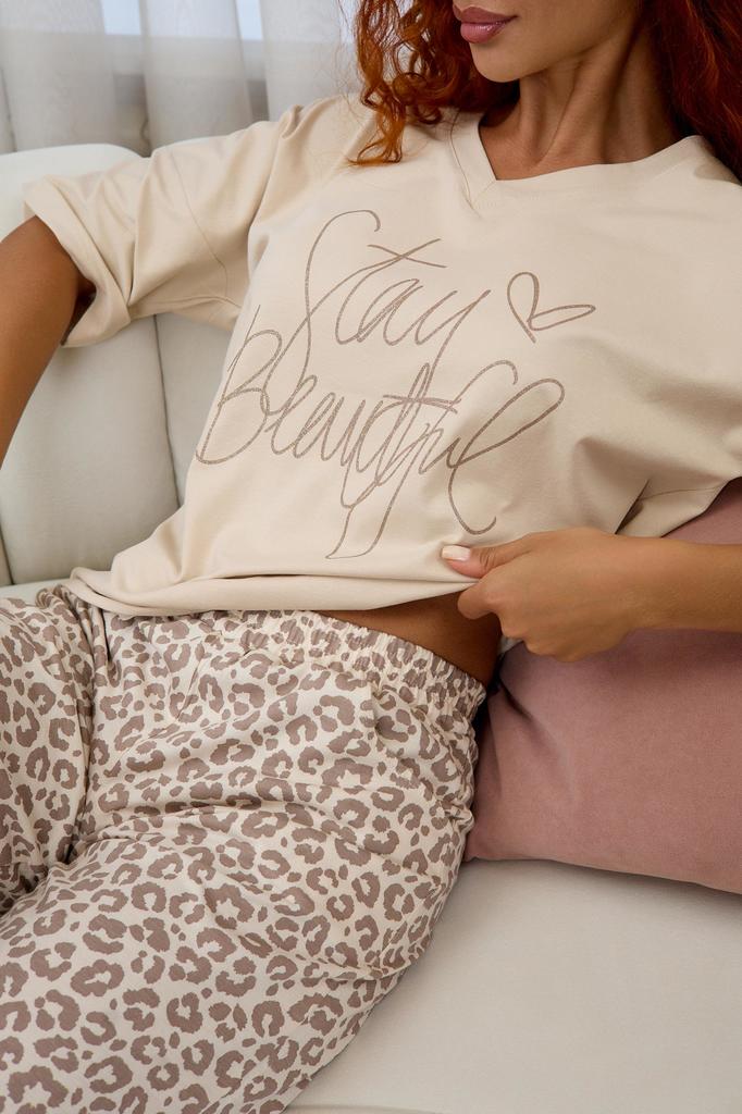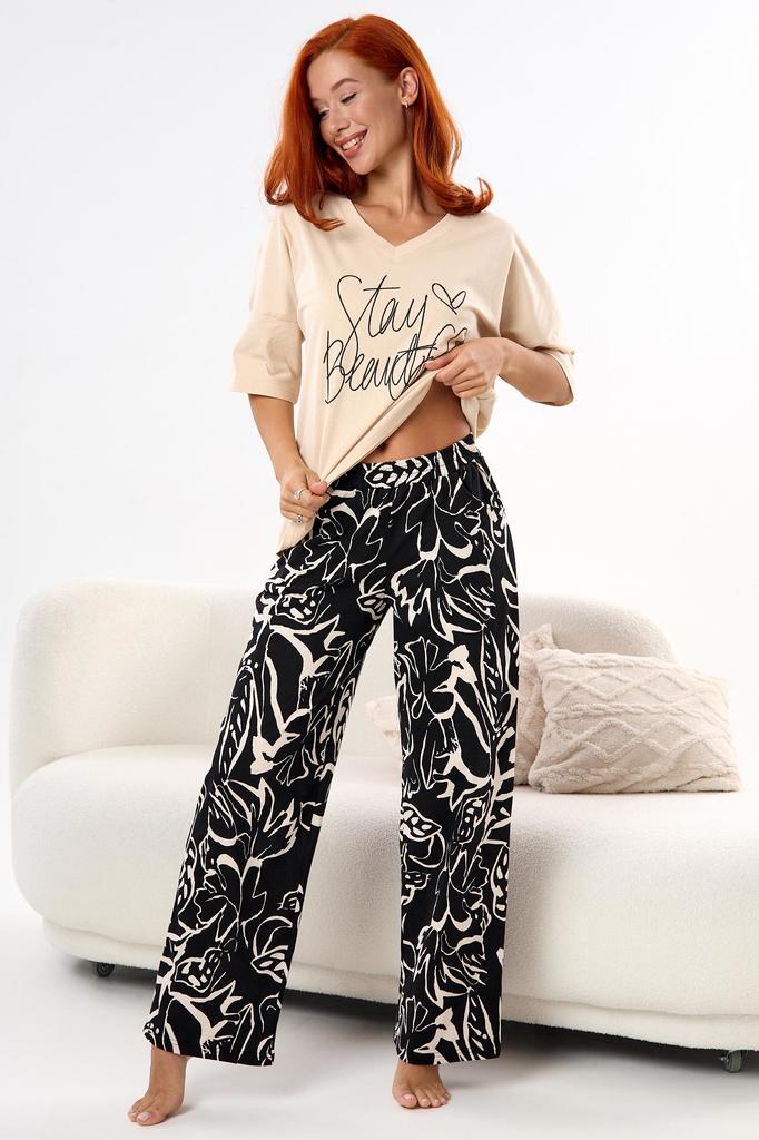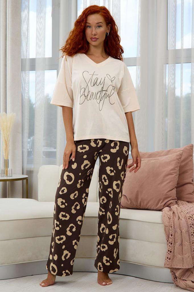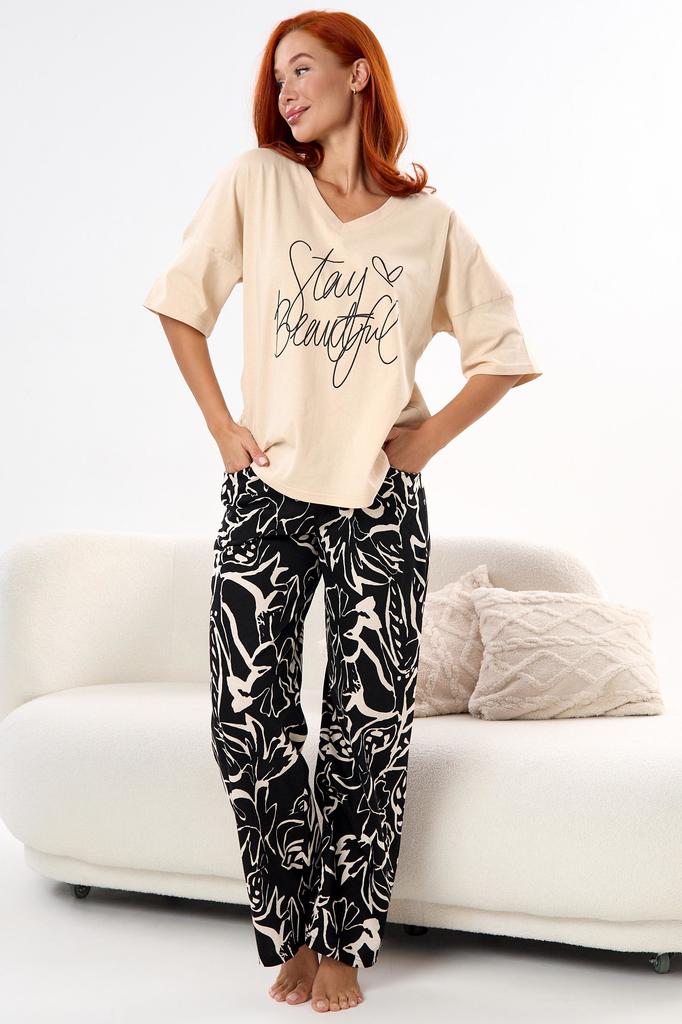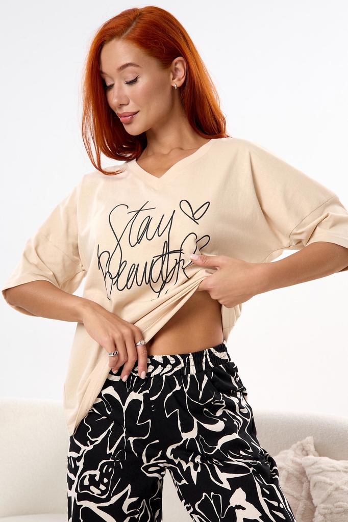 Пижама из 100% хлопка, мягкая, дышащая и комфортная к телу. Комплект состоит из футболки с V-образным вырезом и прямых брюк на резинке с удобными карманами. Благодаря стильному свободному крою её можн... Показать описаниео использовать не только для сна, но и как полноценную домашнюю одежду. Широкий размерный ряд позволяет подобрать идеальный вариант для любой фигуры. * Артикул: 10401 * Состав Хлопок 100% * ГОСТ 31409-2009 * Цвет Бежевый/Черный * Изготовитель ИП Вартанян Марина Валерьевна * Торговая марка Lika Dress * Тип ткани Кулирка * Длина изделия Футболка: 48/50-62, 52/54-63, 56/58-65, 60/62-67 Брюки: 48/50-76, 52/54-76, 56/58-76, 60/62-76 * Для кого для женщин * ТН ВЭД 6108310000