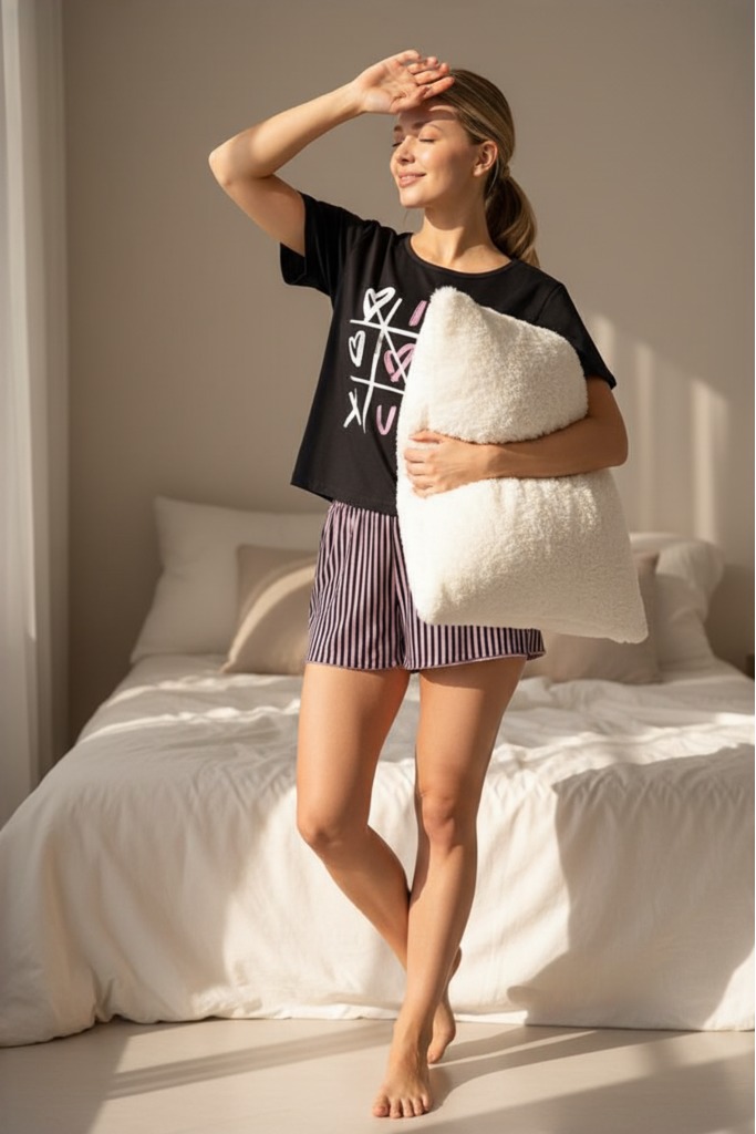 Удобная и стильная пижама для комфортного сна и отдыха. Модель состоит из свободной футболки и шорт, выполненных из кулирки — 100% хлопка, которая мягко прилегает к телу, хорошо пропускает воздух и об... Показать описаниееспечивает максимальный комфорт. Удобные разрезы по бокам шорт добавляют комфорт в носке, придают "изюминку" модели. Свободная посадка делает пижаму идеальной для расслабленного домашнего образа. * Артикул: 10375 * Состав Хлопок 100% * Цвет Черный/коричневый * Изготовитель ИП Вартанян Марина Валерьевна * Торговая марка Lika Dress * Тип ткани Кулирка * Для кого для женщин * ТН ВЭД 6108310000