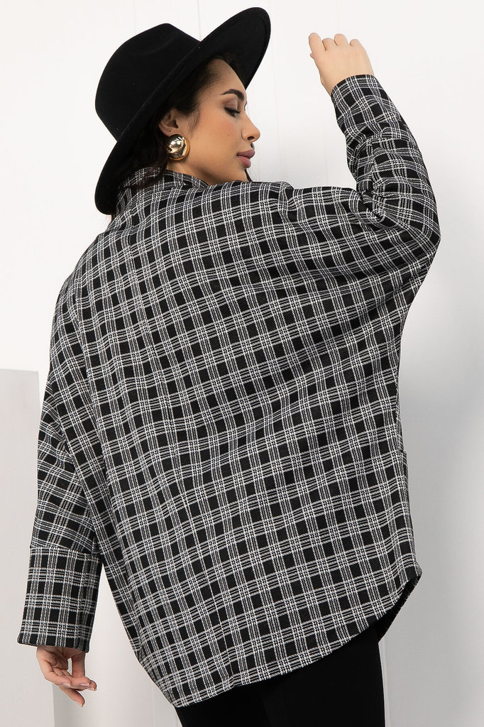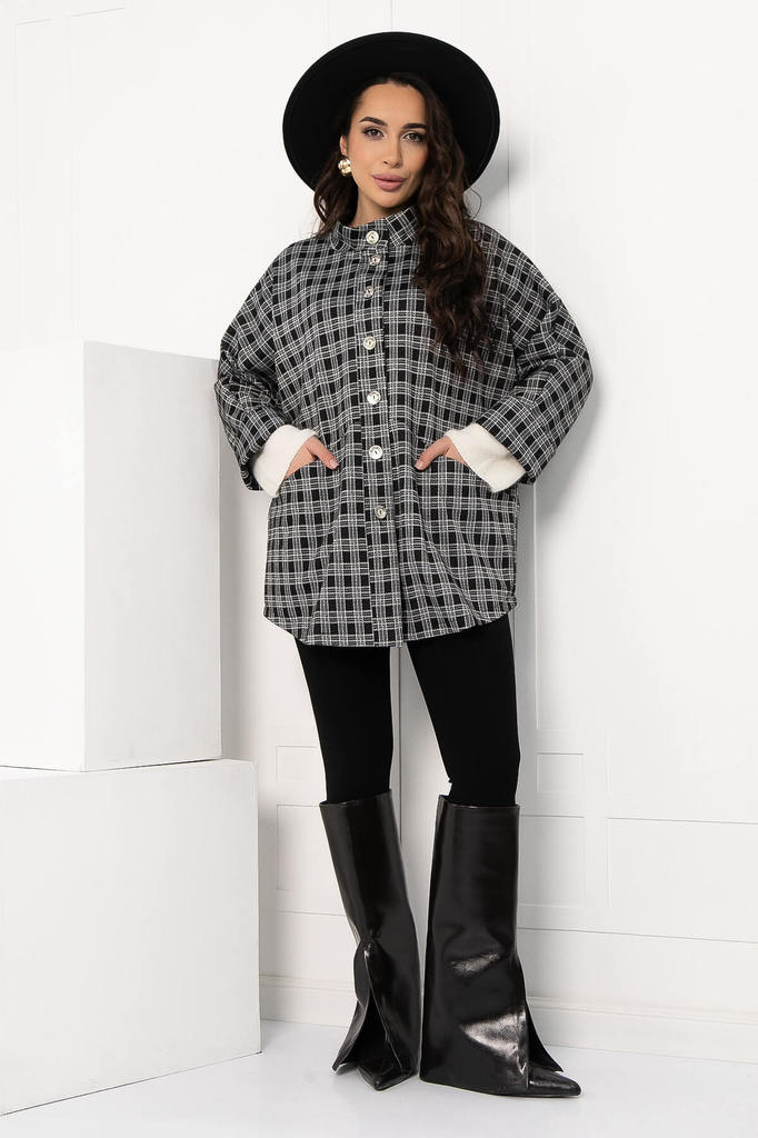Артикул: Б12802-4М. Тип ткани: смесовая. Состав: 65% полиэстер, 30% вискоза, 5% эластан. Материал: трикотаж. Цвет: чёрный. Принт: клетка. Вид застежки: пуговицы. Силуэт: свободный. Карм... Показать описаниеаны: есть. Подкладка: отсутствует. Декоративные элементы: пуговицы. Длина по спинке от верхней точки плеча: M (46-48) - 77 см, L (50-52) - 77 см, XL (54-56) - 77 см. Размер изделия на модели: M (46-48) Рост модели: 167 см. Отснято со свитером Б12899-12М Жакет свободного кроя — это стильный и универсальный элемент гардероба, который поможет создать множество образов. Воротник-стойка плавно переходит в планку на пуговицах, что придаёт изделию элегантный и современный вид. Цельнокроеные рукава и манжеты, которые можно отгибать, позволяют экспериментировать с образом. Удобные карманы добавляют функциональности, делая пальто практичным выбором для повседневной носки. Этот жакет станет незаменимым элементом вашего гардероба, сочетая в себе комфорт и стиль. Уход за изделием: ручная стирка до 30 градусов; нельзя отбеливать; отжим запрещён; гладить при t не более 110 С; гладить с изнанки. Внимание! Рекомендуем ориентироваться на размерную сетку и выбирать свой привычный размер, согласно размерной таблице. *Допуск отклонения длины при массовом производстве 1-3 см является нормой.