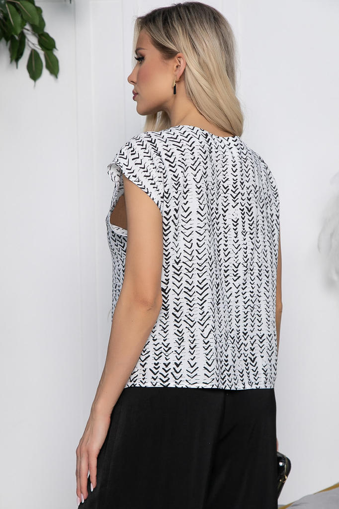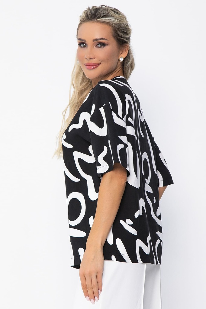 Артикул: Б8520. Ткань: блузочная "Прада". Состав: 95% п/э, 5% эластан. Цвет: черный, белый. Принт: геометрический. Вид застежки: без застёжки. Силуэт: свободный. Карманы: отсутствуют. Т... Показать описаниеип горловины: V-образный. Длина изделия по спинке: 44/ 69 см, 46-48/ 70 см, 50-52/ 72 см, 54/ 73 см. Рост модели: 168 см. Легкая и воздушная блуза свободного кроя с привлекательными вырезами на рукавах. Такой акцент делают блузу еще более привлекательной и подчеркивает женственность. Изделие отлично будет гармонировать с классическими брюками и юбками. Мягкий V-образный вырез красиво подчеркивает зону декольте. Рукав длинный на высоком манжете с пуговицей. Уход за изделием: ручная стирка до 30 градусов; нельзя отбеливать; деликатный отжим; гладить при t не более 110 С; гладить с изнанки. *Допуск отклонения длины при массовом производстве 1-3 см является нормой.