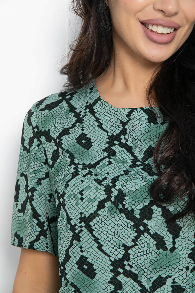 Артикул: Б12378-25. Тип ткани: синтетическая. Состав: 97% полиэстер, 3% эластан. Материал: блузочная "Прада". Цвет: зелёный. Принт: змеиный. Вид застежки: пуговица. Силуэт: прямой. Карм... Показать описаниеаны: отсутствуют. Подкладка: отсутствует. Декоративные элементы: отсутствуют. Длина по спинке от верхней точки плеча: 44-46/ 67 см, 48/ 69 см, 50/ 70 см. Размер изделия на модели: 44 Рост модели: 167 см. Эффектная блузка с принтом в виде змеиного узора станет вашим любимым нарядом. Она прекрасно дополнит как повседневный стиль, так и станет отличным выбором для особых случаев и деловых встреч. Блузку можно носить заправленной или навыпуск, а также сочетать с жакетами. Уход за изделием: ручная стирка до 30 градусов; нельзя отбеливать; отжим запрещён; гладить при t не более 110 С; гладить с изнанки. Внимание! Рекомендуем ориентироваться на размерную сетку и выбирать свой привычный размер, согласно размерной таблице. *Допуск отклонения длины при массовом производстве 1-3 см является нормой.