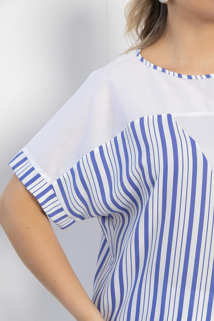 Артикул: Б7107. Тип ткани: натуральная. Состав: 100% хлопок. Материал: штапель. Цвет: белый, синий. Принт: абстракция. Вид застежки: отсутствует. Карманы: отсутствуют. Силуэт: свободный... Показать описание. Подкладка: отсутствует. Декоративные элементы: отсутствуют. Длина по спинке от верхней точки плеча: 44-46/ 68 см, 48-52/ 69 см. Размер изделия на модели: 44. Рост модели: 170 см. Повседневная, удобная блуза. V-образная горловина, по бокам разрезы, плечо спущено. Отличный компаньон к брючкам, джинсам и юбкам. Осенью как нижний слой под пиджак или кардиган. Уход за изделием: ручная стирка до 30 градусов; нельзя отбеливать; отжим запрещён; гладить при t не более 110 С; гладить с изнанки. Внимание! Рекомендуем ориентироваться на размерную сетку и выбирать свой привычный размер, согласно размерной таблице. *Допуск отклонения длины при массовом производстве 1-3 см является нормой.