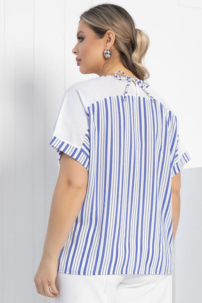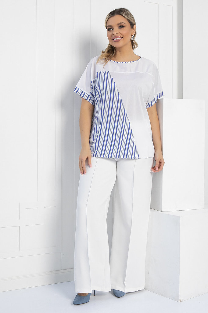 Артикул: Б12840-24М. Тип ткани: смесовый. Состав: 65% вискоза, 30% полиэстер, 5% эластан. Материал: блузочный. Цвет: бело-сиреневый. Принт: синея полоска. Вид застежки: завязки. Карманы:&nbs... Показать описаниеp;отсутствуют. Силуэт: свободный. Подкладка: отсутствует. Декоративные элементы: отсутствуют. Длина по спинке от верхней точки плеча: 46-52/ 68 см. Размер изделия на модели: 52 Рост модели: 170 см. Блузка отснята с брюками арт. Б12685-13 Блуза свободного кроя — это идеальный выбор для создания стильного и непринужденного образа! Спущенные плечи и разрезной перед добавляют ей изюминку, которая делает её уникальной. Округлая горловина плавно переходит в завязки на спине, что придаёт блузе оригинальный и женственный вид. Эта модель идеально сочетается с джинсами или юбками, что делает её универсальным вариантом для повседневной носки. Уход за изделием: ручная стирка до 30 градусов; нельзя отбеливать; отжим запрещён; гладить при t не более 110 С; гладить с изнанки. Внимание! Рекомендуем ориентироваться на размерную сетку и выбирать свой привычный размер, согласно размерной таблице. *Допуск отклонения длины при массовом производстве 1-3 см является нормой.