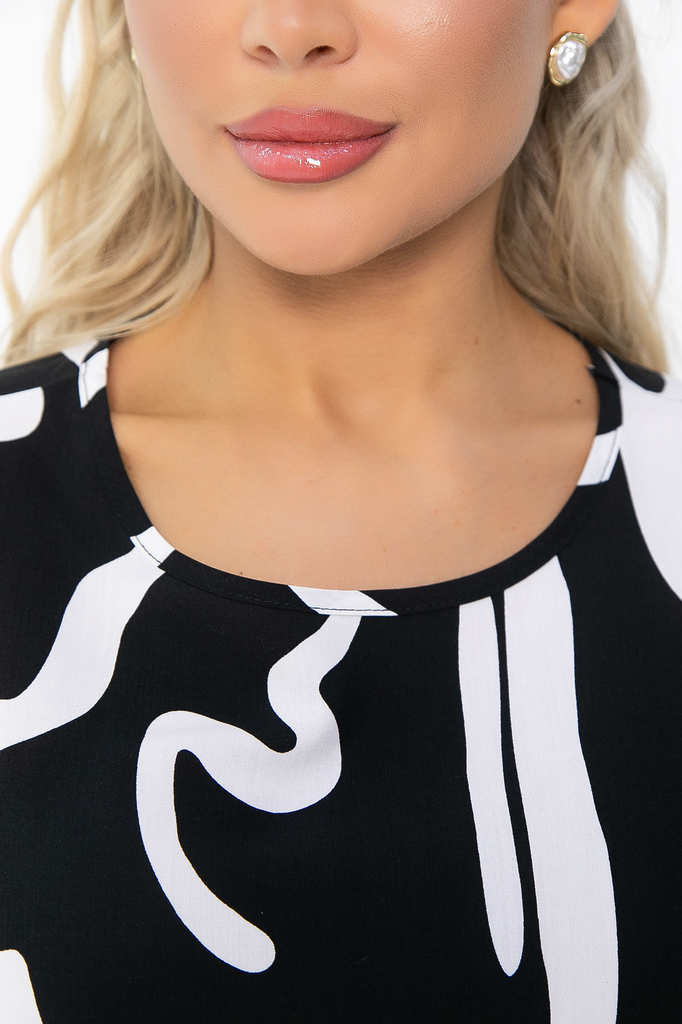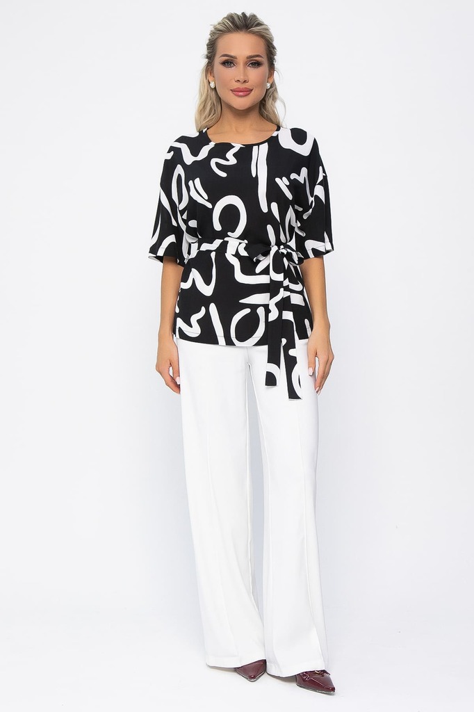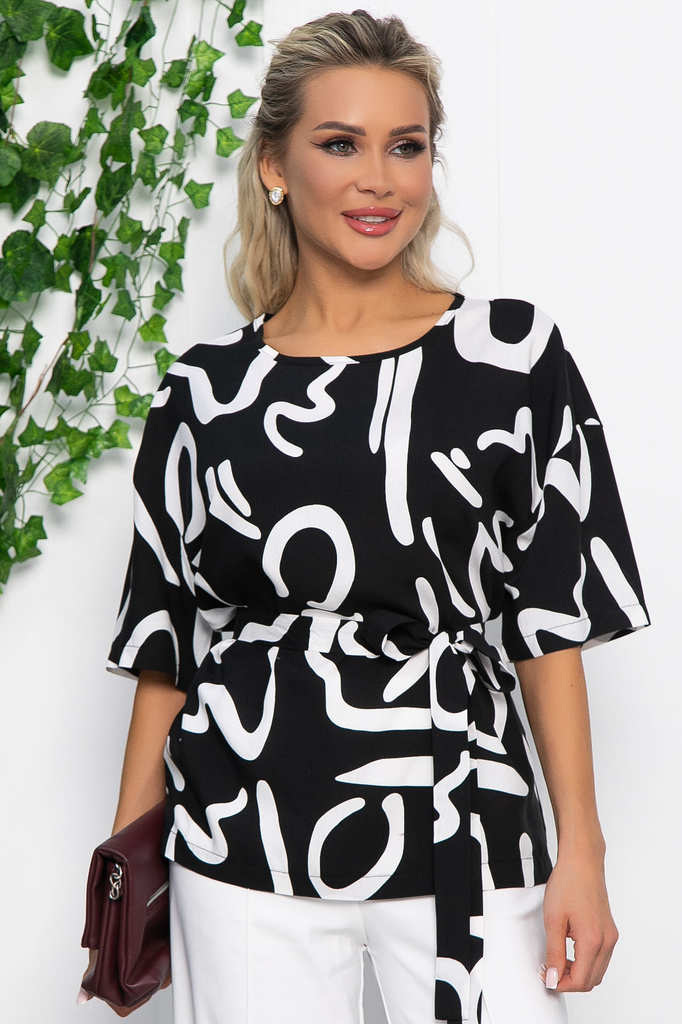 Состав: 50% хлопок, 50% вискоза. Материал: штапель. Цвет: чёрный. Принт: белые разводы. Силуэт: свободный. Карманы: отсутствуют. Подкладка: отсутствует. Вид застежки: без застёжки. Декоратив... Показать описаниеные элементы: отсутствуют. Длина: 44/ 62 см, 46/ 64 см, 48/ 66 см, 50/ 67 см. Блузка отснята с брюками арт.Б12685-13 Блузка с абстрактным принтом — идеальное дополнение к вашему гардеробу. Свободный короткий рукав и округлый вырез горловины придают ей современный и элегантный вид. В комплекте идет тканевый пояс, который подчеркивает талию и создает стильный силуэт. Эта блузка прекрасно подходит как для деловых встреч, так и для повседневной носки, легко сочетаясь с различными элементами гардероба. Создавайте яркие образы и будьте в центре внимания с этой блузкой! Уход за изделием: ручная стирка до 30 градусов; нельзя отбеливать; отжим запрещён; гладить при t не более 110 С; гладить с изнанки. Внимание! Рекомендуем ориентироваться на размерную сетку и выбирать свой привычный размер, согласно размерной таблице. *Допуск отклонения длины при массовом производстве 1-3 см является нормой.