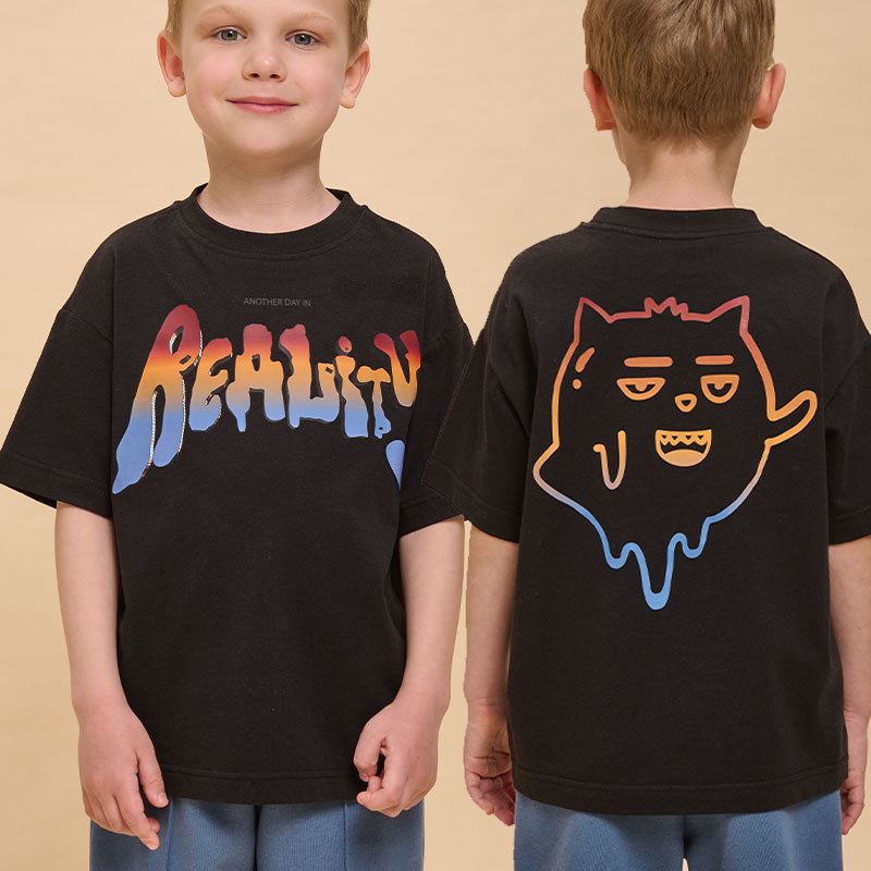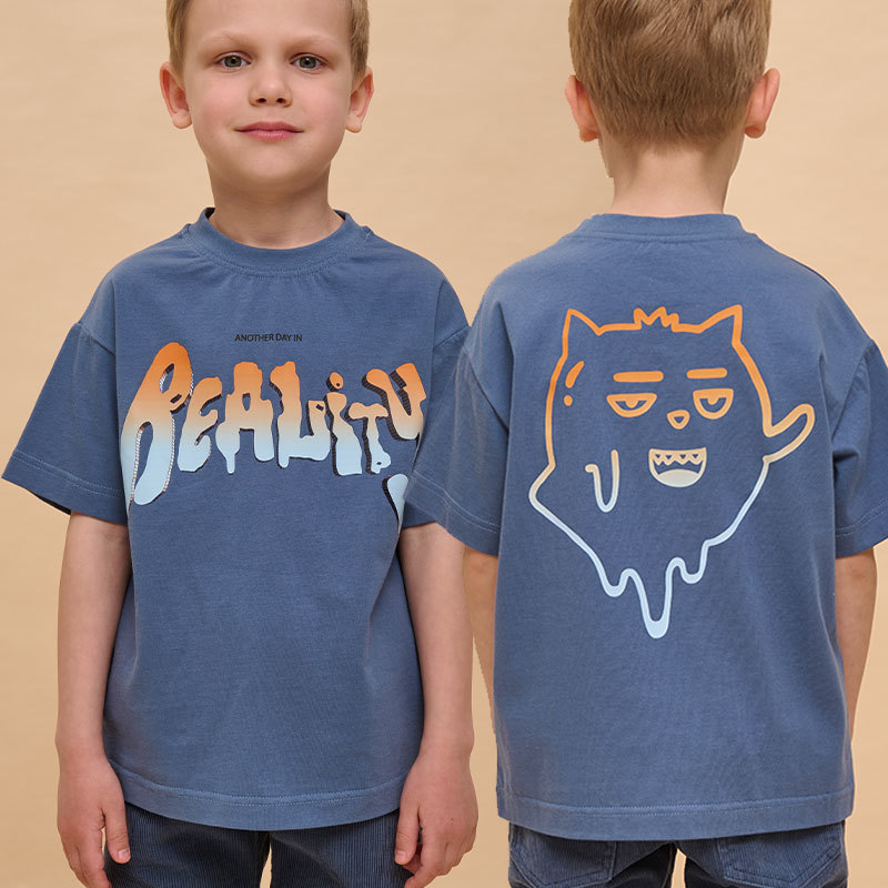Состав: 100%хлопокОписание: Детская футболка для мальчика. Комфортная майка умеренного оверсайз-объёма со спущенным плечом подарит ребёнку свободу движений. Вырез горловины обработан эластичной рибано... Показать описанией (ткань в рубчик) — она отлично держит форму, не растягивается, при этом ребёнку удобно надевать и снимать футболку. Изделие неприхотливо в уходе. Футболка детская с принтом в актуальном готическом стиле по переду и спинке. Надпись переводится: «ещё один день в реальности». Принт эластичный и устойчивый, хорошо переносит многочисленные стирки. В составе ткани 100% хлопка — майка мягкая, воздухопроницаемая, приятная на ощупь. Футболка для мальчиков выполнена в универсальной расцветке, её легко сочетать с различными брюками, джинсами. Детские футболки с принтом подходят как для маленьких мальчиков, так и для подростков. Оверсайз-футболка для мальчика подходит для любого времени года, её можно носить как летом, так и в холодное время года в качестве среднего слоя одежды. Помните о правильном уходе за изделием: рекомендуется стирать при температуре не выше 30 °C, без предварительного замачивания, с изнанки. Это поможет сохранить качество и цвет футболки на длительное время. Не забывайте о выборе правильного размера. Используйте таблицу размеров на фотографии, чтобы выбрать подходящий вариант для вашего мальчика. Обратите внимание, что цвет товара на экране вашего устройства может отличаться от реального.