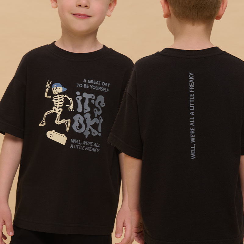 Состав: 100%хлопокОписание: Детская футболка для мальчика. Комфортная майка умеренного оверсайз-объёма со спущенным плечом подарит ребёнку свободу движений. Вырез горловины обработан эластичной рибано... Показать описанией (ткань в рубчик) — она отлично держит форму, не растягивается, при этом ребёнку удобно надевать и снимать футболку. Изделие неприхотливо в уходе. Футболка детская с принтом в актуальном готическом стиле. Надписи переводятся: «хороший день, чтобы быть собой», «всё окей!», «все мы немного странные». Принт эластичный и устойчивый, хорошо переносит многочисленные стирки. Фишка модели — принт светится в темноте! Это не оставит равнодушным ни одного ребёнка! В составе ткани 100% хлопка — майка мягкая, воздухопроницаемая, приятная на ощупь. Футболка для мальчиков выполнена в универсальной расцветке, её легко сочетать с различными брюками, джинсами. Детские футболки с принтом подходят как для маленьких мальчиков, так и для подростков. Оверсайз-футболка для мальчика подходит для любого времени года, её можно носить как летом, так и в холодное время года в качестве среднего слоя одежды. Помните о правильном уходе за изделием: рекомендуется стирать при температуре не выше 30 °C, без предварительного замачивания, с изнанки. Это поможет сохранить качество и цвет футболки на длительное время. Не забывайте о выборе правильного размера. Используйте таблицу размеров на фотографии, чтобы выбрать подходящий вариант для вашего мальчика. Обратите внимание, что цвет товара на экране вашего устройства может отличаться от реального.