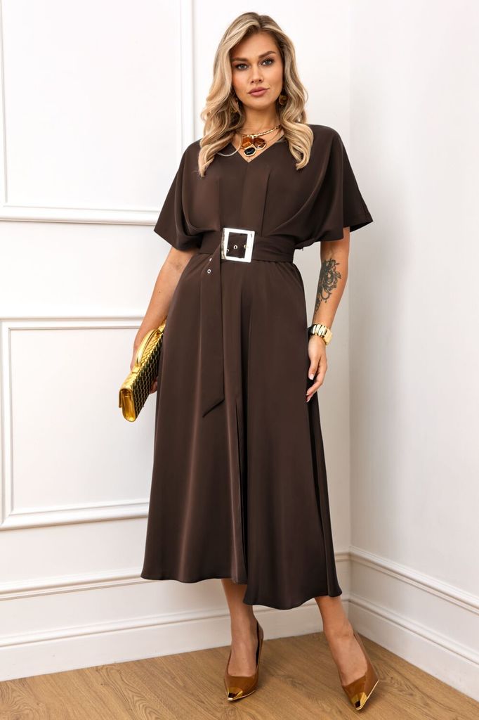Состав: Вискоза-32%; ПЭ-65%; Эластан-3%; Элегантное нарядное платье, выполнено из роскошной струящейся плательной ткани с добавлением вискозы. Платье с V-образным вырезом горловины, отрезное по линии ... Показать описаниеталии. Верхняя часть платья выполнена в свободном стиле со спущенной линией плеча и глубокими складками на линии талии, что придает платью особый стиль и шарм. Юбка платья с расклешением, по переду с разрезом. В боковом шве платья потайная молния застежка. Рукав цельнокроеный, объёмный, со спущенной линией плеча. В комплекте к платью идет съемный пояс с шикарной золотой пряжкой. Модель удобная и практичная, вы будете в нем выглядеть неотразимо и нарядно.