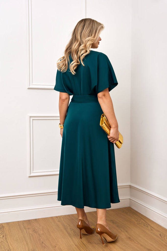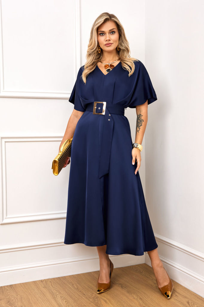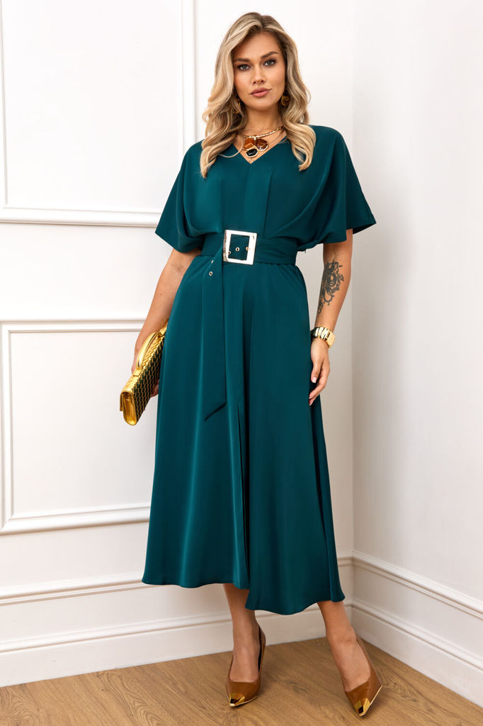 Состав: Вискоза-32%; ПЭ-65%; Эластан-3%; Элегантное нарядное платье, выполнено из роскошной струящейся плательной ткани с добавлением вискозы. Платье с V-образным вырезом горловины, отрезное по линии ... Показать описаниеталии. Верхняя часть платья выполнена в свободном стиле со спущенной линией плеча и глубокими складками на линии талии, что придает платью особый стиль и шарм. Юбка платья с расклишением, по переду с разрезом. В боковом шве платья потайная молния застежка. Рукав цельнокроеный, объёмный, со спущенной линией плеча. В комплекте к платью идет съемный пояс с шикарной золотой пряжкой. Модель удобная и практичная, вы будете в нем выглядеть неотразимо и нарядно.