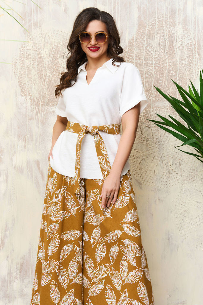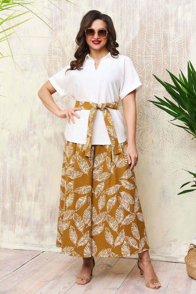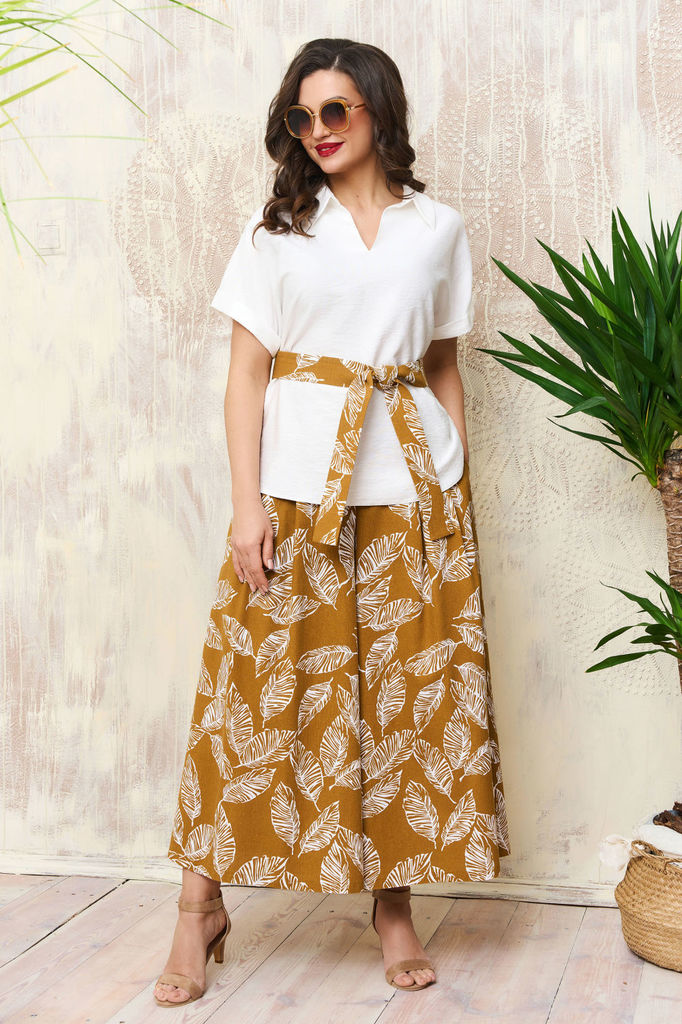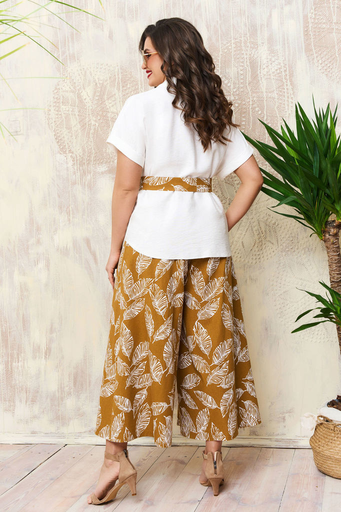 Стильный женский комплект, состоит из блузки и кюлот. Блуза прямого силуэта, выполнена из натуральной ткани с добавлением хлопка, льна и вискозы (мнется не сильно, за счет добавления вискозы), горлови... Показать описаниена блузки с воротником-стойкой и небольшим V-образным вырезом. Рукав блузки цельнокроеный с манжетой. Кюлоты выполнены из натуральной льняной ткани с добавляем хлопка и вискозы. Кюлоты на поясе с застежкой на пуговицы и молнию, в боковых швах функциональные карманы. В комплект входит съемный пояс из основной ткани. Модель удобная и практичная, отлично подойдет для ежедневной носки в жаркое время, вы будете выглядеть неотразимо.