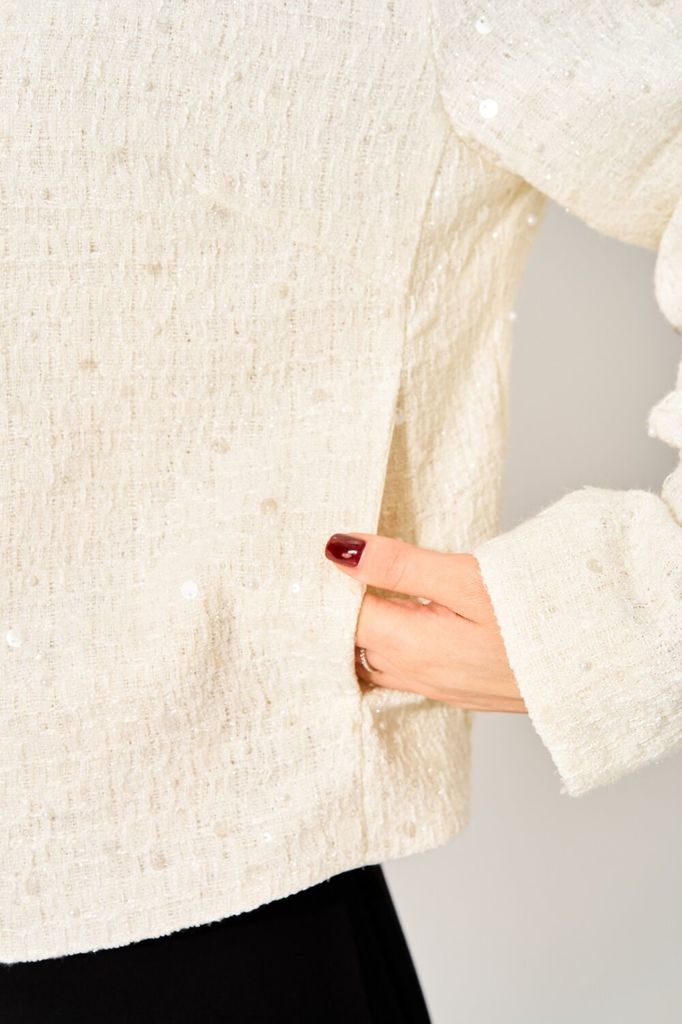Состав: ПЭ-80%; Шерсть-20%; Нарядный жакет от LAIKONY свободного силуэта с пайетками. Жакет длиной до линии бедер с центральной застёжкой на декоративную тесьму-молнию. Вырез горловины «под горло», с ... Показать описаниевтачной стойкой из отделочной ткани. Детали переда с отрезными бочками, в швах обработаны карманы, центральные части с нагрудными вытачками. Деталь спинки блузона с кокеткой, на нижней части по центру в шве обработана складка. Рукава втачные одношовные, линия плеча спущена. Низ жакета обработан обтачкой. Фурнитура может отличаться от представленной на фотографии. Длина изделия по спинке 51-53 см в зависимости от размера, длина рукава 56 см от шва втачивания. В нашем шикарном жакете вы будете блистать на новогоднем корпоративе и любом другом торжественном мероприятии.