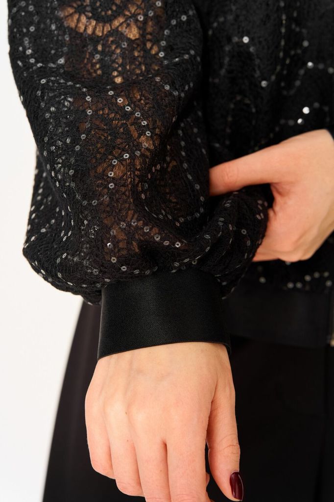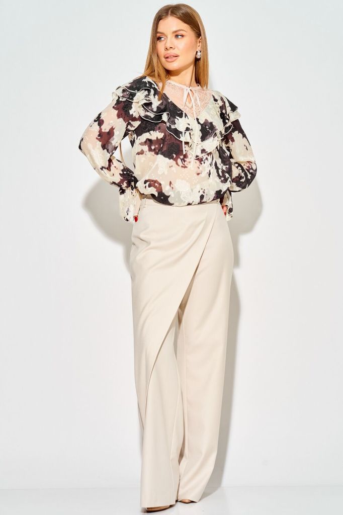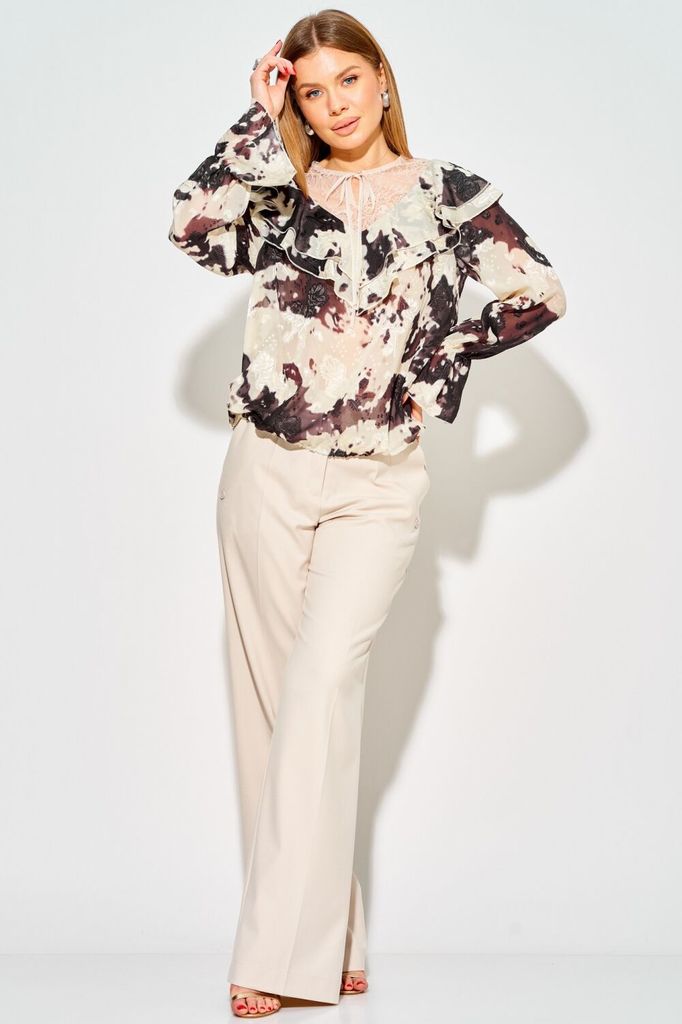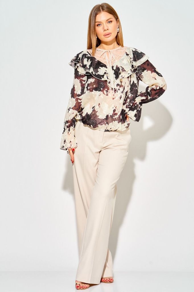 Состав: Вискоза-12%; ПЭ-88%; Нарядная блуза от LAIKONY свободного силуэта из шифона. Блуза длиной до линии бедер с центральной застёжкой на декоративную тесьму-молнию. Вырез горловины блузки «под горл... Показать описаниео», обработан планкой. Деталь переда и спинки с кокеткой из отделочной ткани, в шов вставлены два волана. Деталь переда кокетки со средним швом, с разрезом и по горловине вставлена тесьма-шнур. Рукава втачные одношовные, понизу собраны на эластичную тесьму. В низ блузки вставлена эластичная тесьма. Длина изделия по спинке 61 см длина рукава 64 см. Наша блуза составит нарядный образ с брюками L-942-2 (на фоото) - и вы будете блистать на любом торжественном мероприятии.