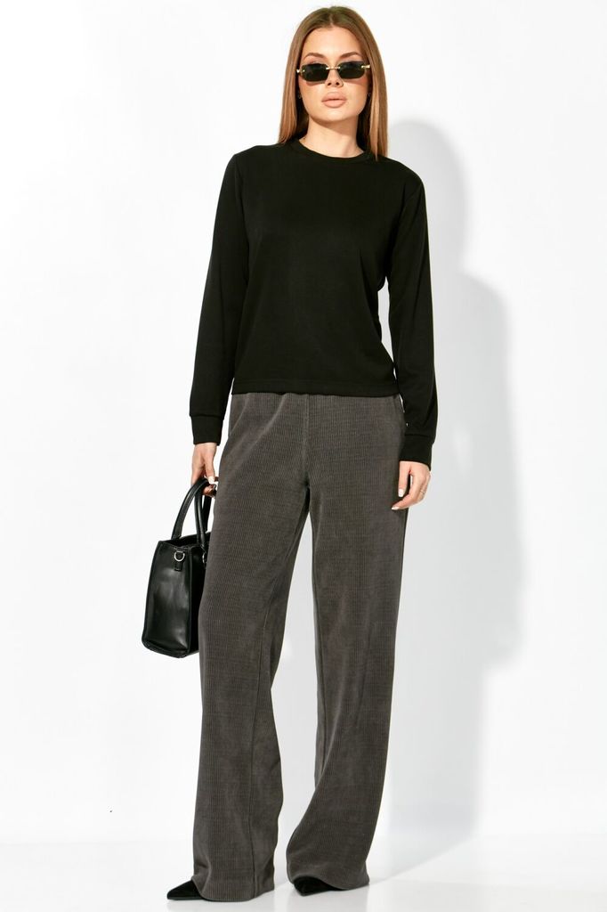 Состав: Джемпер: Вискоза-70%; ПЭ-25%; Спандекс-5%; Брюки: ПЭ-100%; Джемпер женский из трикотажного полотна, свободного силуэта, длиной до линии бедер, с втачными рукавами. На спинке на уровне ло... Показать описаниепаток по центру расположен декоративный элемент. Вырез горловины округлой формы, с втачной бейкой. Рукава втачные одношовные короткие. Брюки из плательно-костюмной ткани прямые к низу и, с притачным поясом, в который частично вставлена эластичная тесьма. На передних половинках брюк в боковых швах обработаны карманы. На поясе прикреплены 5 шлёвок, через которые протянут пояс. В боковых швах внизу обработаны шлицы.Джемпер: длина рукава - 20см, ширина рукава – 22см, длина спинки – 63см. Брюки: длина по боковому шву – 105см.