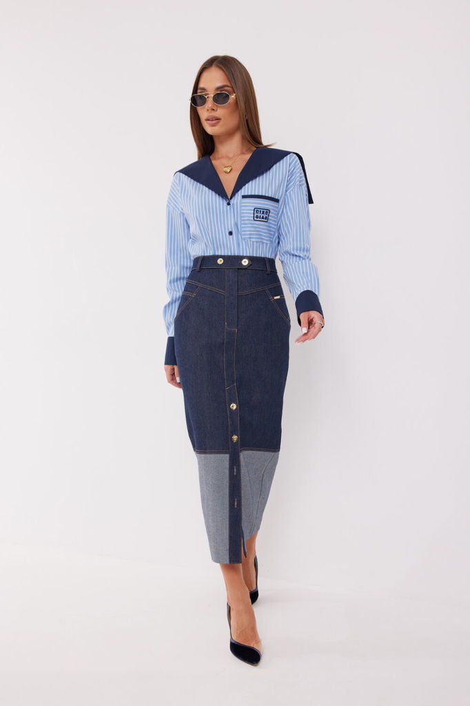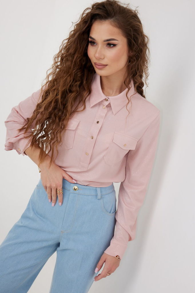 Состав: ПЭ-95%; Спандекс-5%; Блузка женская из блузочной ткани с деликатным блеском, свободного силуэта, с застежкой по переду сверху до низа блузки на пять петель и пуговиц. Рукава длинные со складко... Показать описанией внизу, низ рукава на манжете, манжет застегивается на петлю и пуговицу. По плечевым швам и рукаву имитация застежки на планку по всей длине. По планке в верхней части четыре петли и декоративные пуговицы, снизу рукав с «распахивающимися» планками. Воротник - невысокая стойка, прилегающий к шее. Блузка декорирована эффектными пуговицами в стиле «скиапарелли». Длина блузки 67 см. Длина рукава с манжетой - 61 см. Измерения по готовому изделию: 44 р-р: ОГ - 109 см., ОТ - 110 см., ОБ - 111 см. 46 р-р: ОГ - 113 см., ОТ - 114 см., ОБ - 115 см. 48 р-р: ОГ - 117 см., ОТ - 118 см., ОБ - 119 см. 50 р-р: ОГ - 121 см., ОТ - 122 см., ОБ - 123 см. 52 р-р: ОГ - 125 см., ОТ - 126 см., ОБ - 127 см.