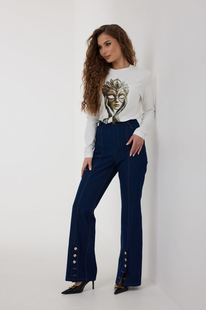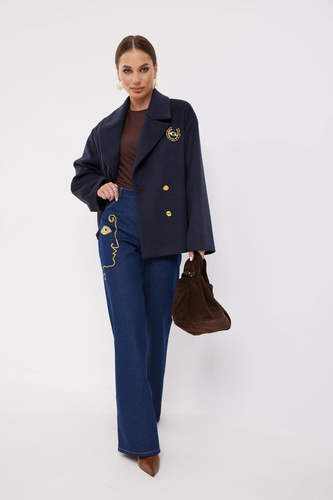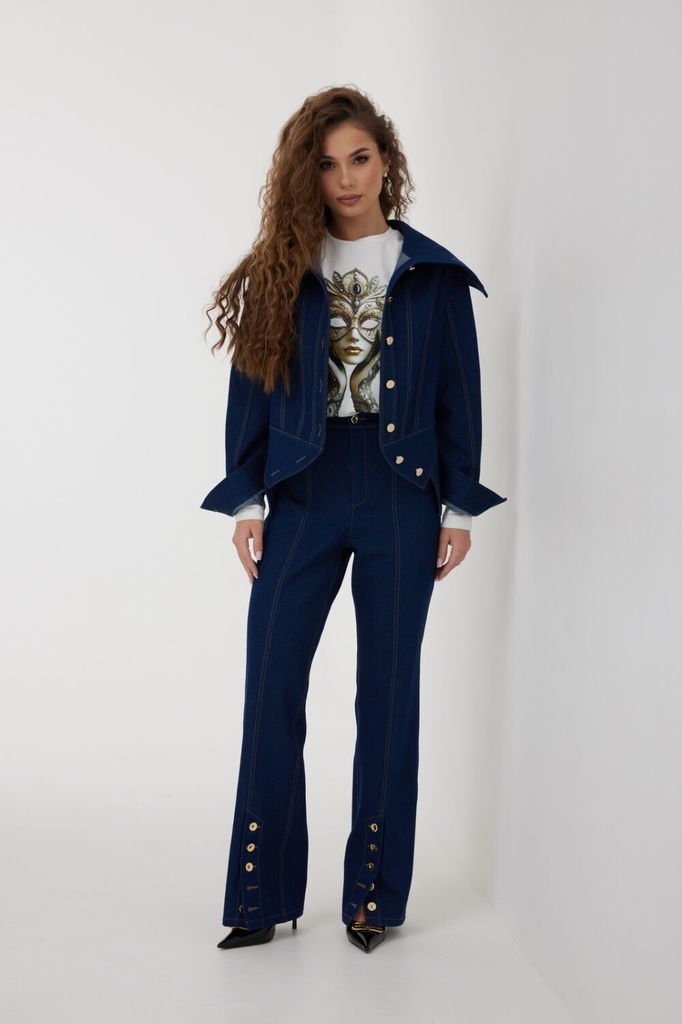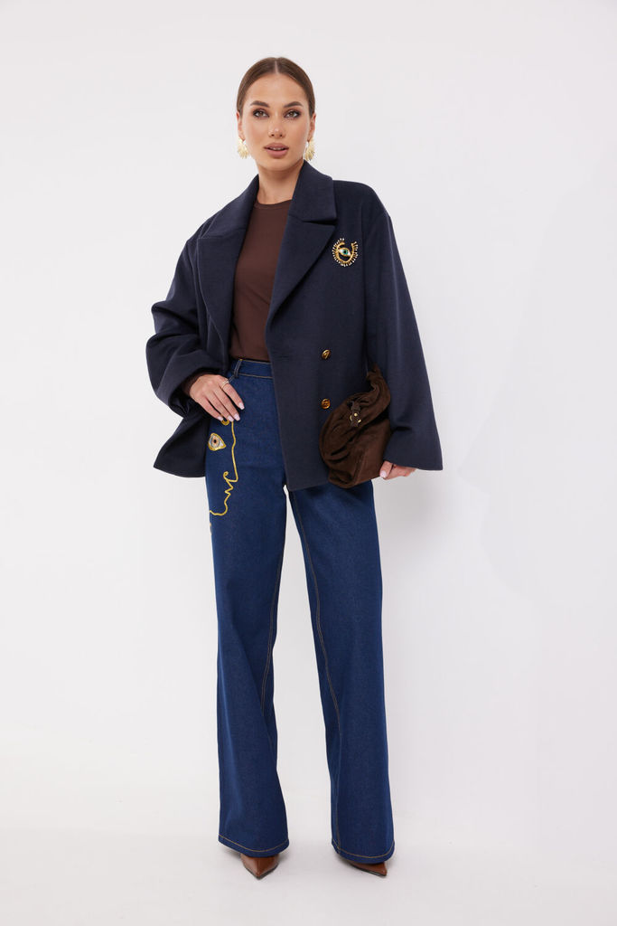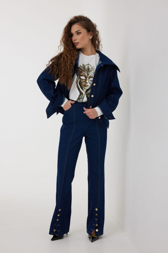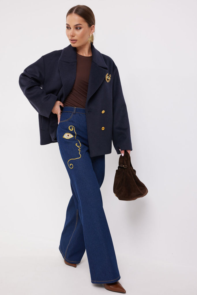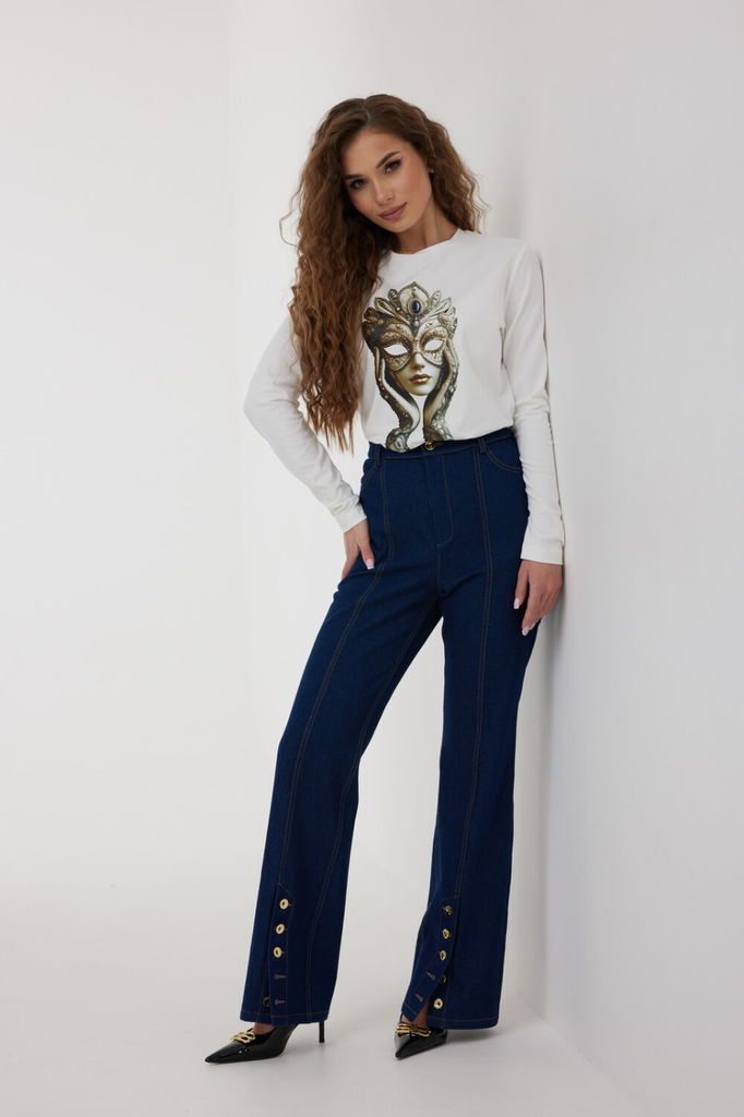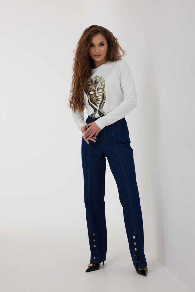 Состав: Спандекс-3%; Хлопок-97%; Джинсы с высокой посадкой прямого силуэта. Застежка на петли и декоративные пуговицы. По переду карманы, сзади накладные карманы. По швам контрастная отделочная строчк... Показать описаниеа. На правой передней половинке брюк стильная вышивка. Длина по боковому шву - 110 см. Длина по шаговому шву - 85 см. Измерения по готовому изделию: 44 р-р: ОТ - 73 см., ОБ - 96 см. 46 р-р: ОТ - 77 см., ОБ - 100 см. 48 р-р: ОТ - 81 см., ОБ - 104 см. 50 р-р: ОТ - 85 см., ОБ - 108 см. 52 р-р: ОТ - 89 см., ОБ - 112 см.
