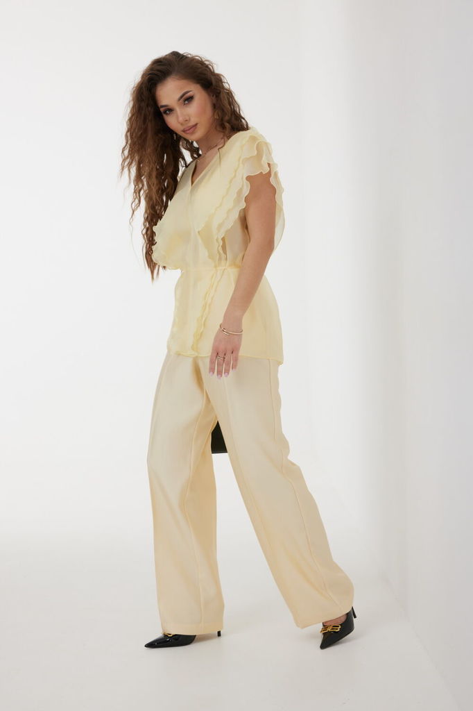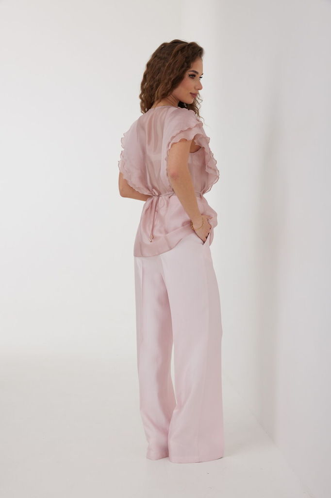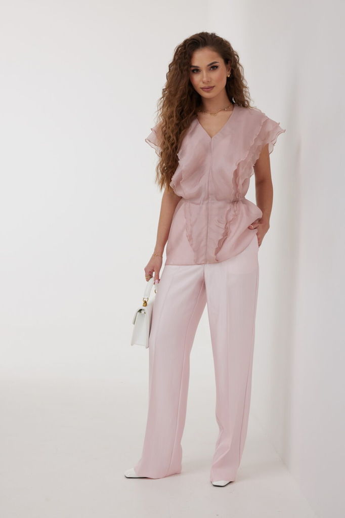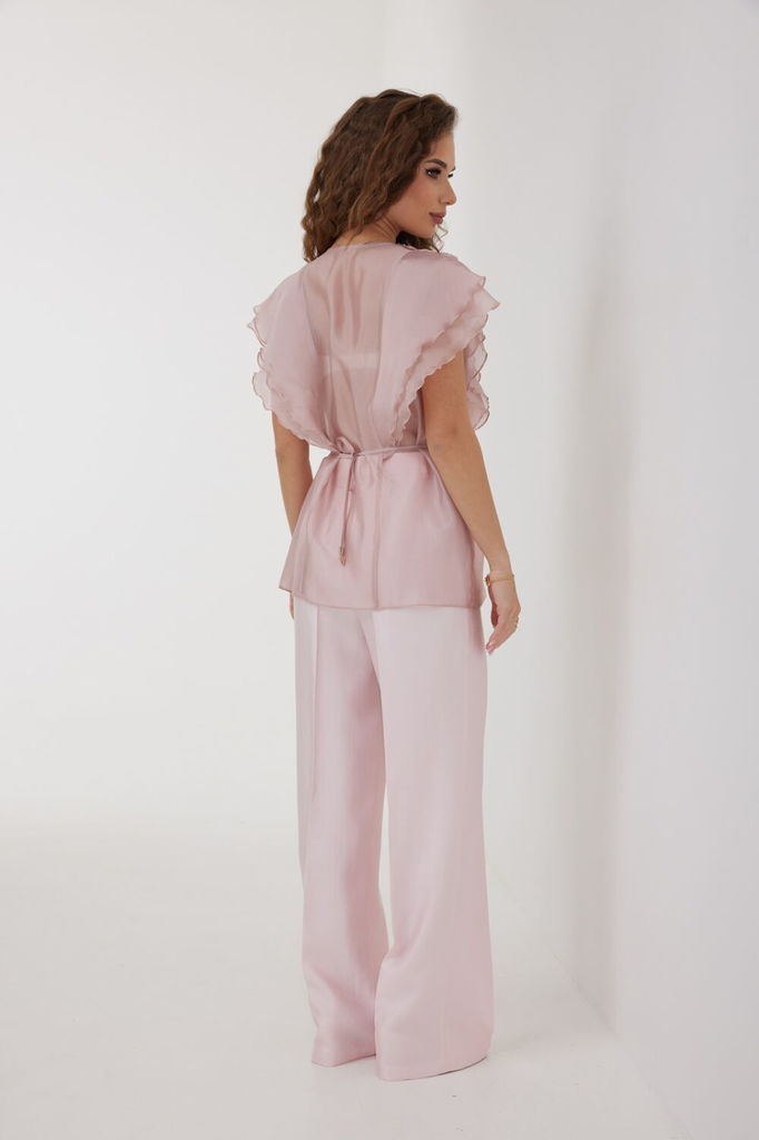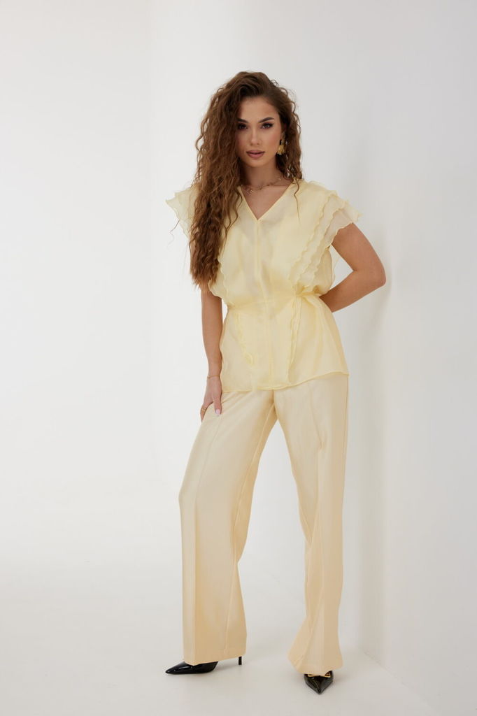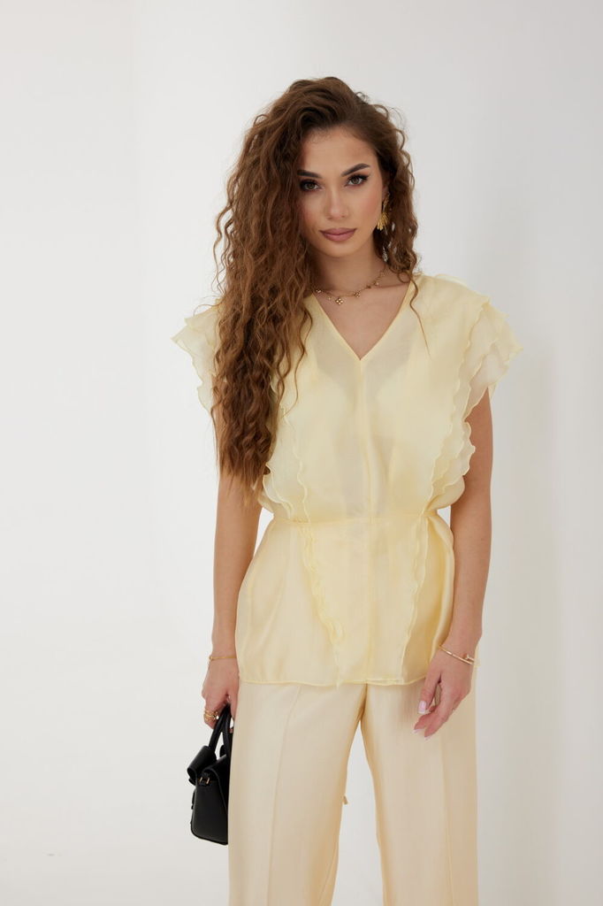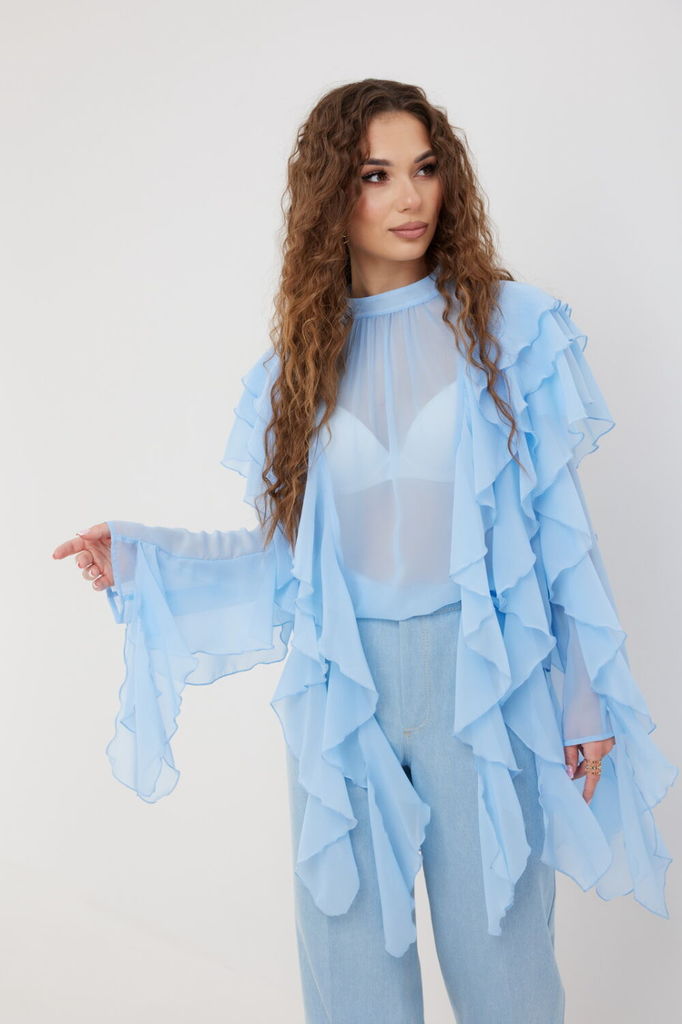 Состав: Вискоза-77%; ПЭ-23%; Блузка прямого силуэта из полупрозрачной ткани «органза». Рукав реглан расширенный, по низу волан. По переду горловина V-образной формы с рюшей и завязками. Перед с д... Показать описаниеекоративным воланом. Перед и спинка двойные. Длина блузки 60 см. Длина рукава 77 см. Измерения по готовому изделию: 44 р-р: ОГ - 106 см., ОТ - 104 см., ОБ - 108 см. 46 р-р: ОГ - 110 см., ОТ - 108 см., ОБ - 112 см. 48 р-р: ОГ - 114 см., ОТ - 112 см., ОБ - 116 см. 50 р-р: ОГ - 118 см., ОТ - 116 см., ОБ - 120 см. 52 р-р: ОГ - 122 см., ОТ - 120 см., ОБ - 124 см.
