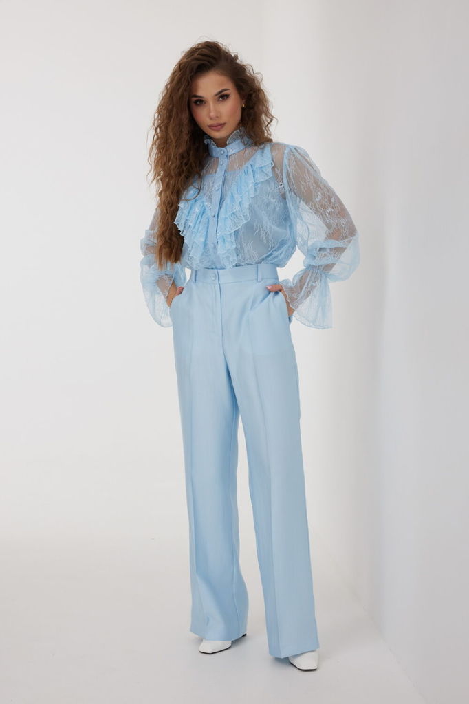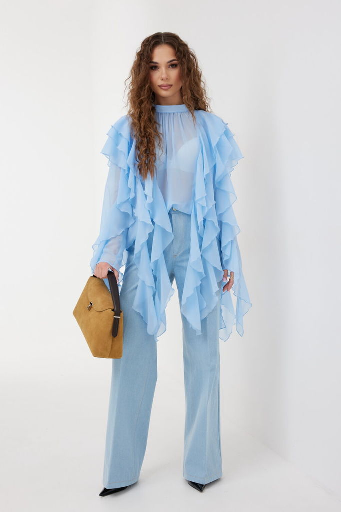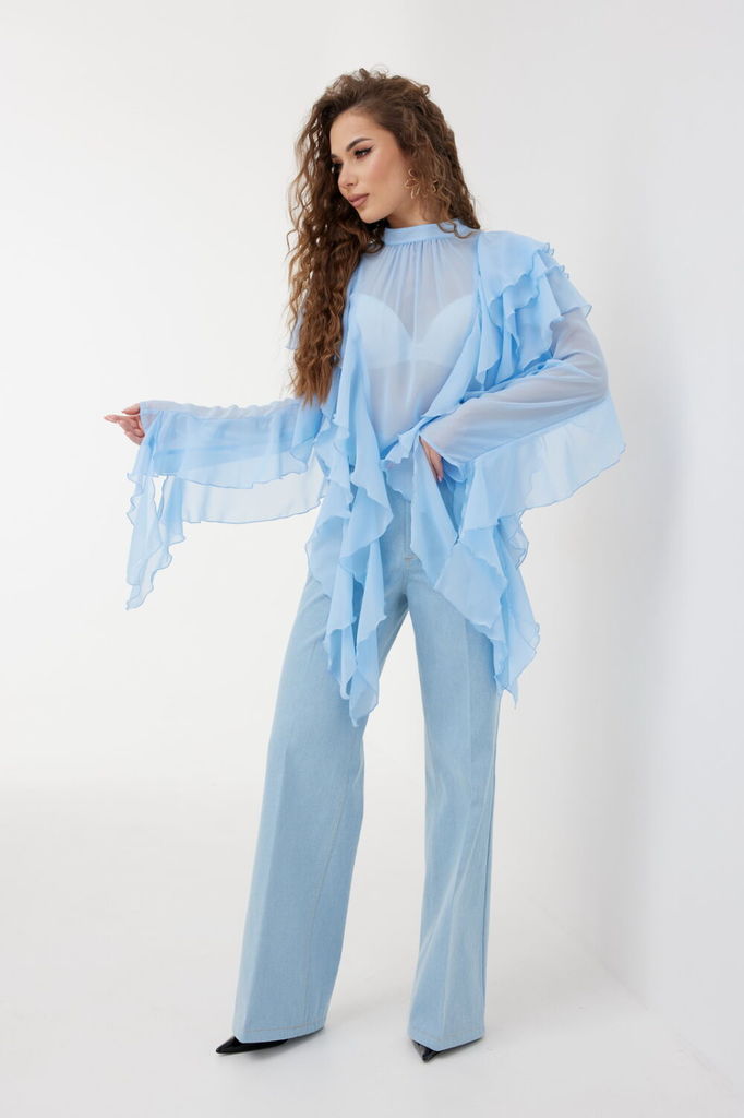 Состав: ПЭ-100%; Блузка женская свободного силуэта, с воздушными воланами по переду, спинке и рукавам, вставленными в подрезы. Воланы удлиненные, ниже уровня низа блузки и рукава. По переду сборка по ... Показать описаниегорловине, воротник-невысокая стойка. Спинка с кокеткой, обработанным разрезом вверху кокетки, и застежкой на две небольшие пуговицы и петли на стойке. Длина блузки 59 см. Длина рукава 62 см. Измерения по готовому изделию: 44 р-р: ОГ - 110 см., ОТ - 116 см., ОБ - 120 см. 46 р-р: ОГ - 114 см., ОТ - 120 см., ОБ - 124 см. 48 р-р: ОГ - 118 см., ОТ - 124 см., ОБ - 128 см. 50 р-р: ОГ - 122 см., ОТ - 128 см., ОБ - 132 см. 52 р-р: ОГ - 126 см., ОТ - 132 см., ОБ - 136 см.