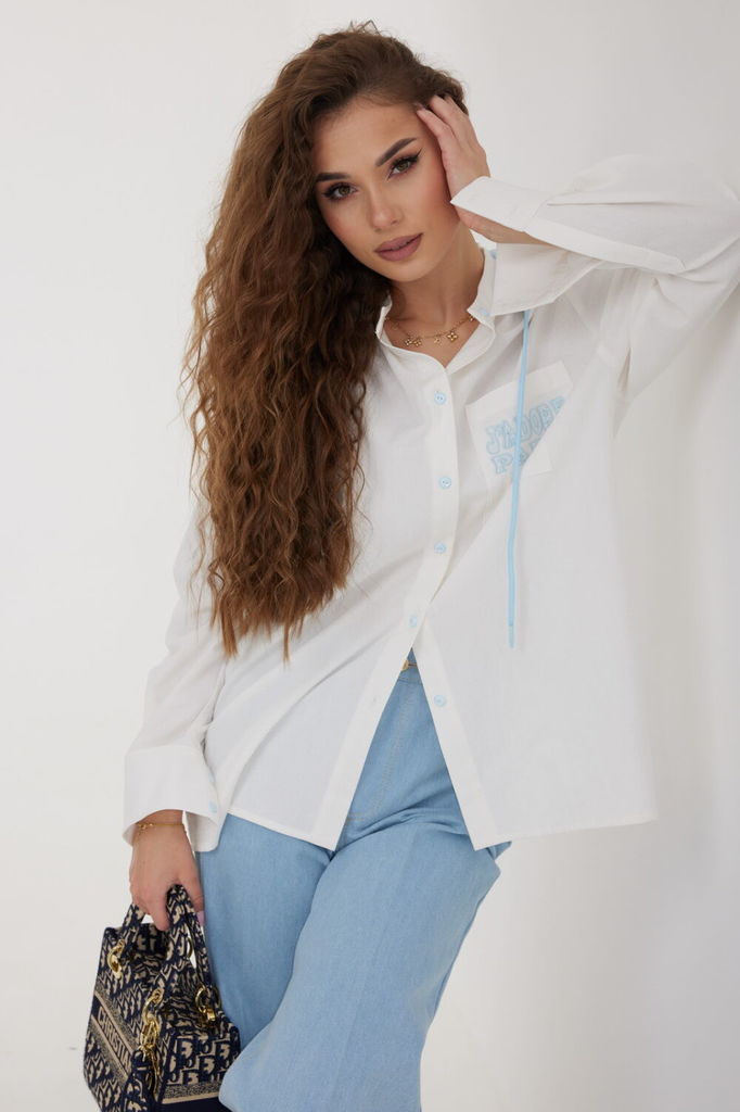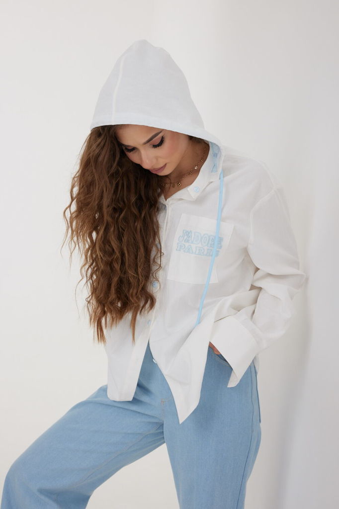 Состав: Хлопок-100%; Блузка женская свободного силуэта со слегка спущенной линией плеча, с капюшоном. Застежка на планку с петлями и пуговицами. Воротник – невысокая стойка. Рукав свободный длинный, п... Показать описаниео низу на манжете, застегивающейся на две пуговицы. По переду слева накладной карман, декорированный вышивкой. Спинка удлиненная, с кокеткой и встречной складкой по центру. Внутренняя часть капюшона из кружева в тон вышивки и фурнитуры. По краю капюшона кулиса с втянутым шнуром. Длина блузки 72 см. Длина рукава 61 см. Измерения по готовому изделию: 44 р-р: ОГ - 112 см., ОТ - 120 см., ОБ - 124 см. 46 р-р: ОГ - 116 см., ОТ - 124 см., ОБ - 128 см. 48 р-р: ОГ - 120 см., ОТ - 128 см., ОБ - 132 см. 50 р-р: ОГ - 124 см., ОТ - 132 см., ОБ - 136 см. 52 р-р: ОГ - 128 см., ОТ - 136 см., ОБ - 140 см.