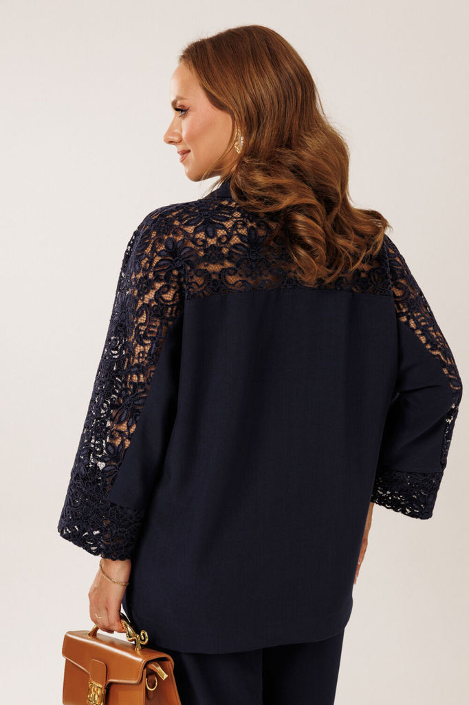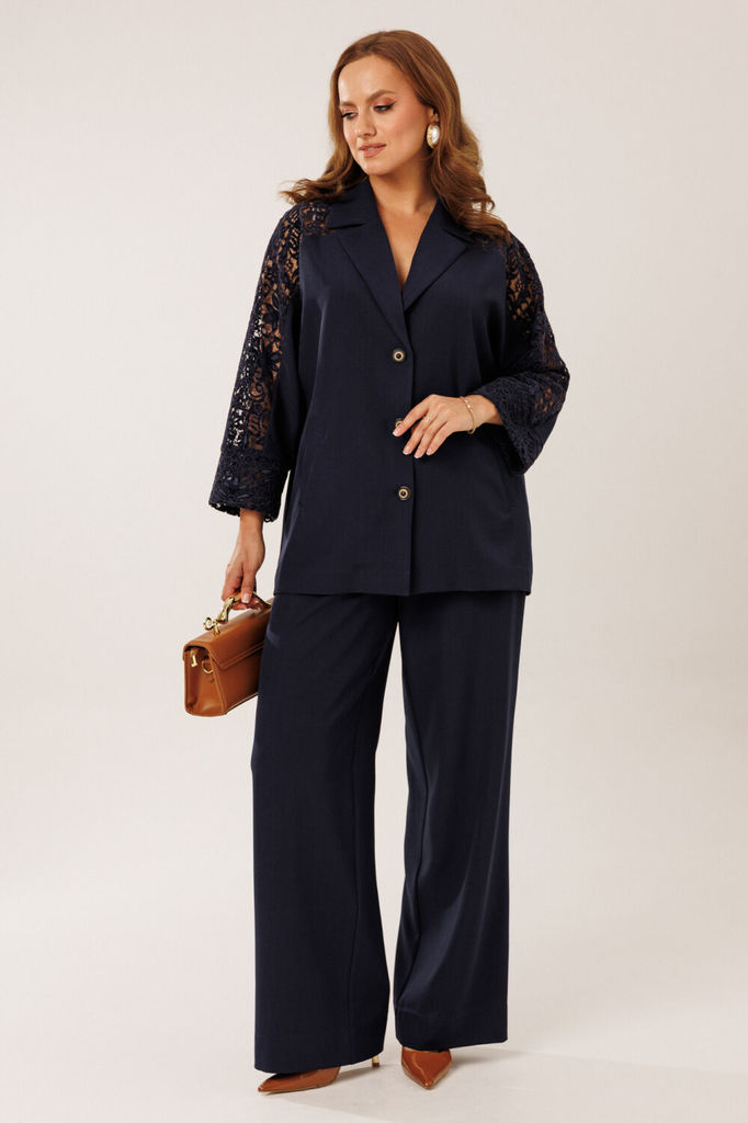Состав: Вискоза-27%; ПЭ-69%; Спандекс-4%; Костюм состоит из жакета с брюками. Жакет однобортный без подкладки, прямого силуэта с цельнокроеными рукавами. На полочках жакета обработаны наклонные прирез... Показать описаниеные карманы «в рамку» с листочкой. Кокетка полочки переходящая в кокетку спинки и верхнюю часть рукава из набивного гипюра в цвет основной ткани жакета. Манжета рукава так же из набивного гипюра. Спинка жакета прямая. Застежка на декоративные петли пуговицы. Горловина обработана втачным воротником с отрезной стойкой и лацканами. Брюки прямого силуэта от бедра с карманами в боковом шве. На передних половинках брюк заложены по 1 складке. По спинке брюк обработаны вытачки. Подгибка низа широкая. Застежка брюк на «молнию» в гульфике. Пояс брюк отрезной с частичной резинкой по спинке брюк. Длина жакета по спинке 46р. - 69,5 см, 52р. - 70 см, Длина брюк по боковому шву 111 см. Цвет материала может отличаться по тону в зависимости от настроек вашего монитора!