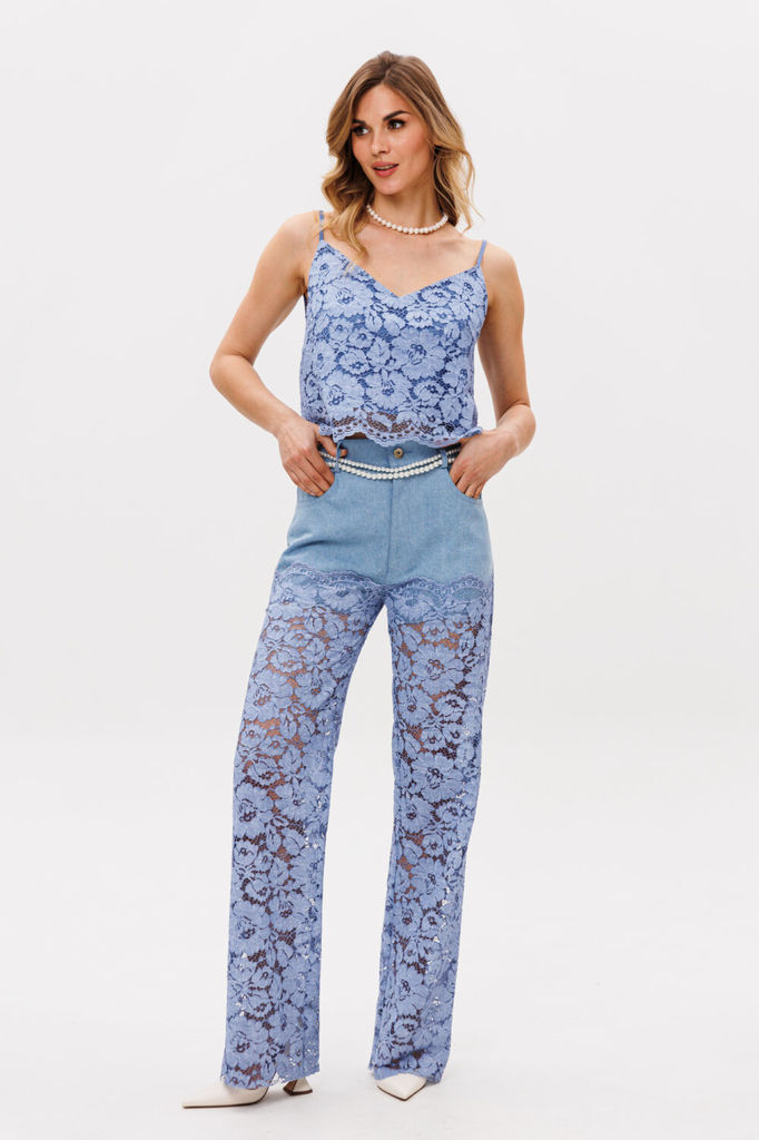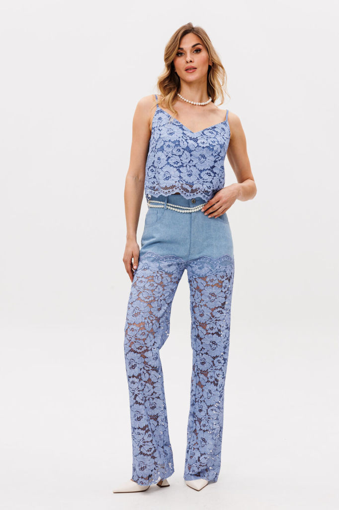 Состав: Хлопок-98%; ПУ-2%; Брюки выполнены из джинса с отделкой из гипюра. Брюки прямого покроя, длиной в пол, на притачном поясе. Верхняя часть брюк выполнена из джинса, нижняя часть из гипюра. Спере... Показать описаниеди боковые карманы с фигурным входом и застежка на молнию. На задних частях кокетки и накладные карманы. Пояс застегивается на пробивную пуговицу. Длина брюк: 110 см. Гарантийный срок не установлен ГОСТ 25294 - 2003