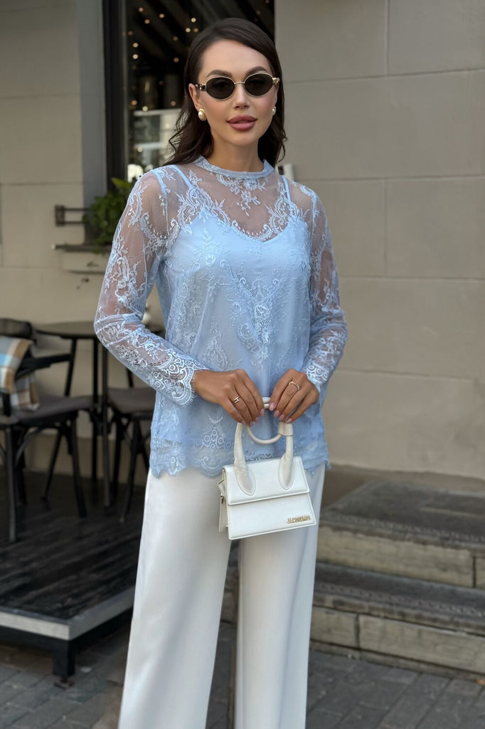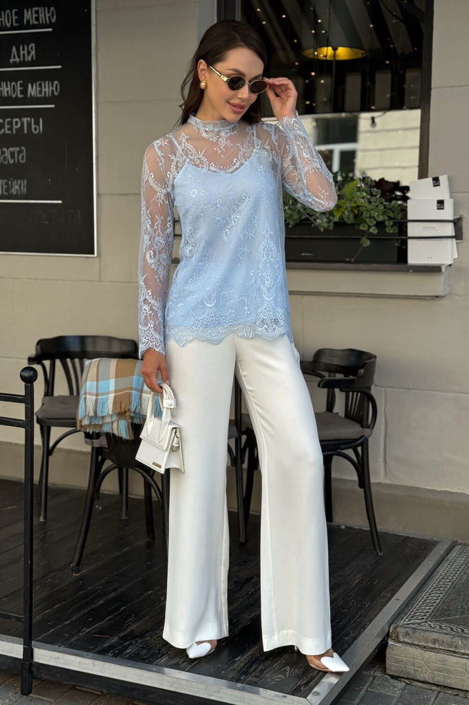 Состав: Блуза- ПЭ-95%; Спандекс-5%; Топ- ПЭ-95%; Спандекс-5%; Сезон: Весна Рост: 164 Страна бренда: Беларусь Состав: Блуза: ПЭ-95%; Спандекс-5%; Топ: ПЭ-95%; Спандекс-5%; Блузка женская нарядная из ги... Показать описаниепюра с топом — комплект 2 в 1 для особых случаев Эта нарядная женская блузка из нежного гипюра — идеальное решение для торжественного образа. Комплект женский 2-х предметный, состоящий из блузы и топа, предназначен как для нарядной, так и для повседневной носки. Блуза женская полуприлегающего силуэта, выполнена из гипюровой ткани. Перед и спинка цельные, без вытачек. Спинка от горловины с застежкой на 1 навесную петлю и пуговицу (размер и цвет фурнитуры может незначительно отличаться от фото). Горловина с воротником-стойкой, с обтачными концами по спинке. Рукава втачные, одношовные, длинные. Низа переда, спинки, рукавов оформлены фестонами. Топ женский, 2-х слойный, полуприлегающего силуэта, на регулируемых бретелях. Верхний и нижний слои выполнены из блузочной ткани. Перед с нагрудными вытачками, выходящими из боковых швов. Низ переда и спинки фигурной формы.