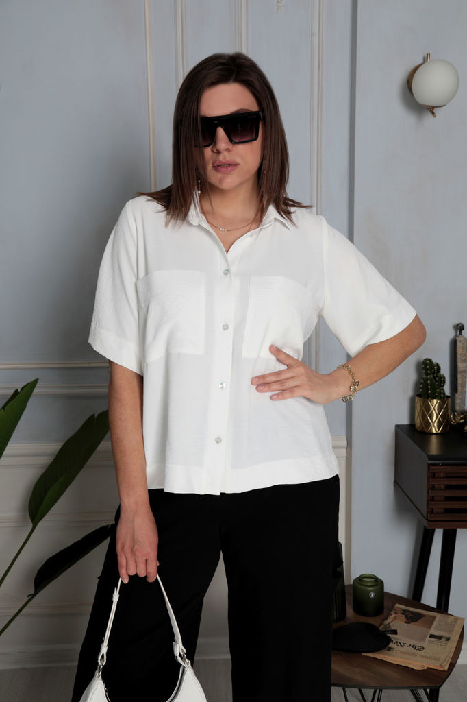 Состав: ПЭ-100%; Сезон: Лето Рост: 170 Страна бренда: Беларусь Состав: ПЭ-100%; Стильная и элегантная блуза прямого кроя идеальна для осеннее-летнего периода. Отлично подойдет как для офисного стиля, ... Показать описаниетак и для повседневного. Ткань очень мягкая, струящаяся и приятная на ощупь, имеет фактурный рельеф. Лекала выполнены таким образом, что позволяют модели «сидеть» идеально и скрыть все недостатки фигуры. Перед имеет застёжку на петли-пуговицы с жемчужным эффектом, а так же декорирован настрочными карманами . Воротник втачной, рубашечного типа. Для того, чтобы правильно подобрать свой размер, необходимо ваш замер объёма груди разделить на 2. (например, объём груди 104:2=52 размер). Замеры в готовом изделии: Длина по центру спинки от плеча: 60 см Длина рукава от проймы: 30 см Обхват груди: 112см/48р; 116см/50р; 120см/52р; 142см/54р; 128см/56р; 133см/58р; 136см/60р; 140см/62р. Рост фотомодели 174 см, размер одежды на фото 52.