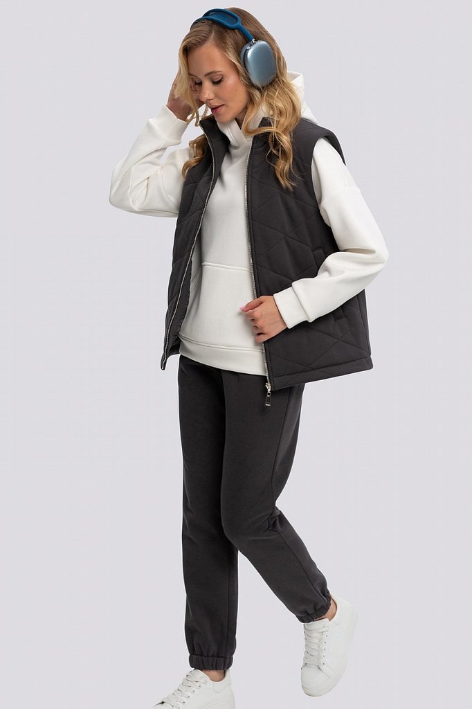 Теплый спортивный костюм женский с жилеткой на молнии - это комплект, представляющий собой идеальное сочетание стиля и функциональности для активного образа жизни и спокойных прогулок на свежем воздух... Показать описаниее. Он создан для девушек и женщин, предпочитающих комфорт и тепло в прохладное и холодное время года. Теплый костюм выполнен из плотного, качественного футера с мягким начёсом внутри, приятным к телу. Это делает его идеальным выбором для весеннего, осеннего и зимнего времени года. Комплект включает в себя худи с капюшоном, брюки, стёганную утеплённую жилетку на молнии. На рукавах и брюках есть фиксирующие манжеты на резинке, которые позволяют сохранять тепло. Декоративные элементы в виде стёжки ромб придают костюму уникальный и запоминающийся вид. Костюм может легко сочетаться с вашей повседневной одеждой и спортивной обувью, создавая гармоничный и стильный образ. Он станет отличным дополнением к вашему гардеробу, сочетая в себе высокое качество, современный дизайн и максимальный комфорт. Трикотаж утепленный на флисе, состав: 75% хлопок, 20% полиэстер, 5 % спандекс. Жилетка на утеплителе термофин, плотностью 60г/м.