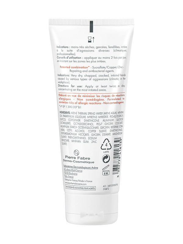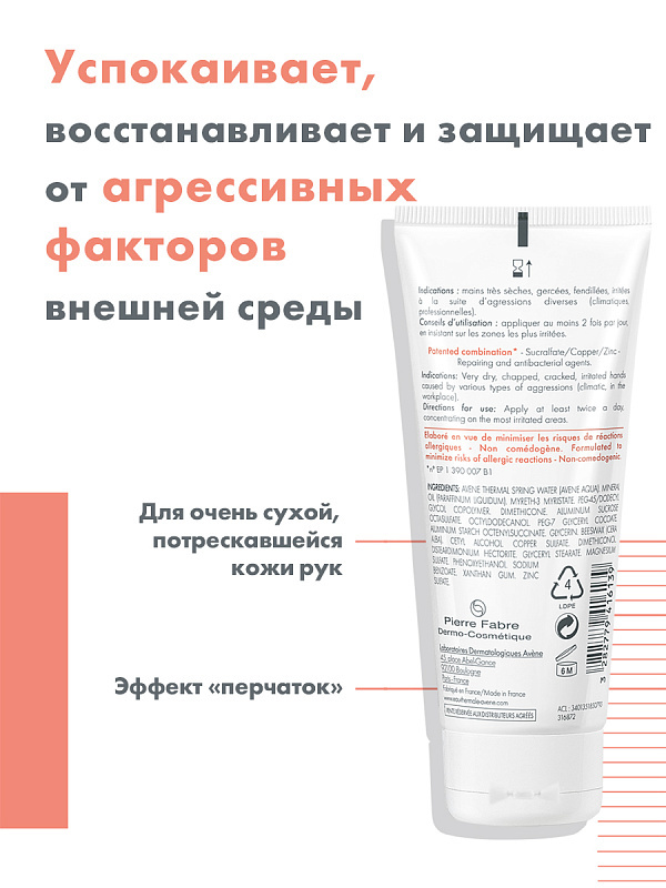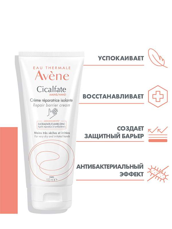 Крем специально разработан для восстановления и защиты очень сухой, раздраженной кожи рук от внешнего агрессивного воздействия. Микронизированный сукральфат - уникальный компонент – ускоряет заживлени... Показать описаниее эпидермиса. Сочетание сульфата меди и сульфата цинка ограничивает риск размножения бактерий на коже. Обогащенный Термальной водой Avene, крем Сикальфат успокаивает поврежденную кожу