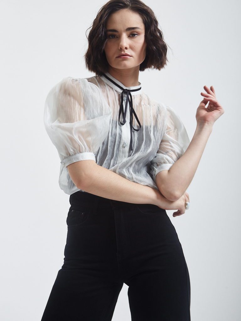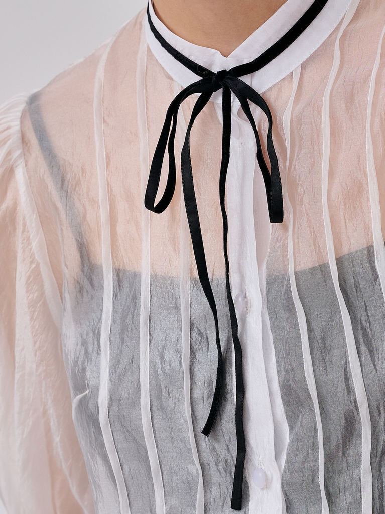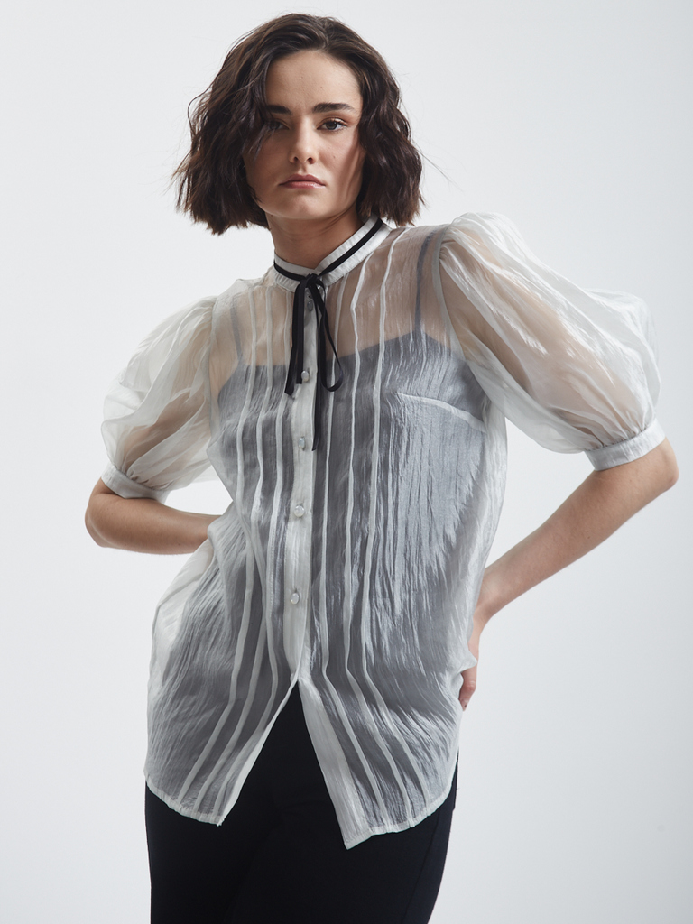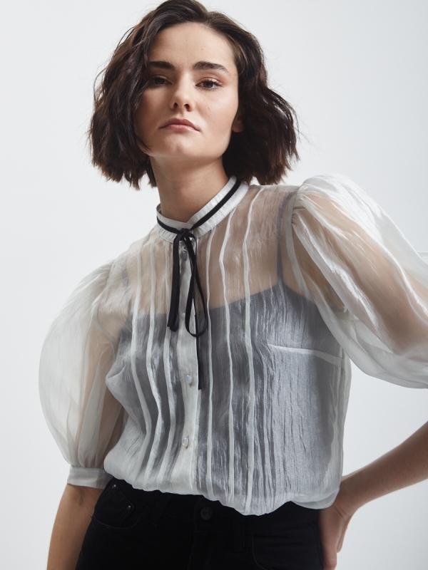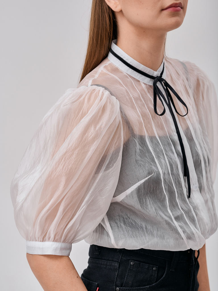 Блузка из органзы прямого силуэта с воротником-стойкой и завязкамиБлузка из органзы прямого силуэта с воротником-стойкой и завязкамиБлузка из органзы прямого силуэта с воротником-стойкой и завязками